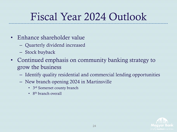 Fiscal Year 2024 Outlook • Enhance shareholder value – Quarterly dividend increased – Stock buyback • Continued emphasis on community banking strategy to grow the business – Identify quality residential and commercial lending opportunities – New branch opening 2024 in Martinsville • 3 rd Somerset county branch • 8 th branch overall 24