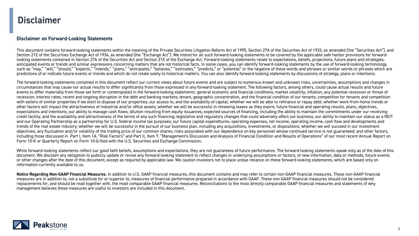 3 Disclaimer Disclaimer on Forward-Looking Statements This document contains forward-looking statements within the meaning of the Private Securities Litigation Reform Act of 1995, Section 27A of the Securities Act of 1933, as amended (the “Securities Act”), and Section 21E of the Securities Exchange Act of 1934, as amended (the “Exchange Act”). We intend for all such forward-looking statements to be covered by the applicable safe harbor provisions for forward- looking statements contained in Section 27A of the Securities Act and Section 21E of the Exchange Act. Forward-looking statements relate to expectations, beliefs, projections, future plans and strategies, anticipated events or trends and similar expressions concerning matters that are not historical facts. In some cases, you can identify forward-looking statements by the use of forward-looking terminology such as “may,” “will,” “should,” “expects,” “intends,” “plans,” “anticipates,” “believes,” “estimates,” “predicts,” or “potential” or the negative of these words and phrases or similar words or phrases which are predictions of or indicate future events or trends and which do not relate solely to historical matters. You can also identify forward-looking statements by discussions of strategy, plans or intentions. The forward-looking statements contained in this document reflect our current views about future events and are subject to numerous known and unknown risks, uncertainties, assumptions and changes in circumstances that may cause our actual results to differ significantly from those expressed in any forward-looking statement. The following factors, among others, could cause actual results and future events to differ materially from those set forth or contemplated in the forward-looking statements: general economic and financial conditions; market volatility; inflation; any potential recession or threat of recession; interest rates; recent and ongoing disruption in the debt and banking markets; tenant, geographic concentration, and the financial condition of our tenants; competition for tenants and competition with sellers of similar properties if we elect to dispose of our properties; our access to, and the availability of capital; whether we will be able to refinance or repay debt; whether work-from-home trends or other factors will impact the attractiveness of industrial and/or office assets; whether we will be successful in renewing leases as they expire; future financial and operating results, plans, objectives, expectations and intentions; our ability to manage cash flows; dilution resulting from equity issuances; expected sources of financing, including the ability to maintain the commitments under our revolving credit facility, and the availability and attractiveness of the terms of any such financing; legislative and regulatory changes that could adversely affect our business; our ability to maintain our status as a REIT and our Operating Partnership as a partnership for U.S. federal income tax purposes; our future capital expenditures, operating expenses, net income, operating income, cash flow and developments and trends of the real estate industry; whether we will be successful in the pursuit of our business plan, including any acquisitions, investments, or dispositions; whether we will succeed in our investment objectives; any fluctuation and/or volatility of the trading price of our common shares; risks associated with our dependence on key personnel whose continued service is not guaranteed; and other factors, including those discussed in Part I, Item 1A. “Risk Factors” and Part II, Item 7. “Management's Discussion and Analysis of Financial Condition and Results of Operations” of our most recent Annual Report on Form 10-K or Quarterly Report on Form 10-Q filed with the U.S. Securities and Exchange Commission. While forward-looking statements reflect our good faith beliefs, assumptions and expectations, they are not guarantees of future performance. The forward-looking statements speak only as of the date of this document. We disclaim any obligation to publicly update or revise any forward-looking statement to reflect changes in underlying assumptions or factors, of new information, data or methods, future events or other changes after the date of this document, except as required by applicable law. We caution investors not to place undue reliance on these forward-looking statements, which are based only on information currently available to us. Notice Regarding Non-GAAP Financial Measures. In addition to U.S. GAAP financial measures, this document contains and may refer to certain non-GAAP financial measures. These non-GAAP financial measures are in addition to, not a substitute for or superior to, measures of financial performance prepared in accordance with GAAP. These non-GAAP financial measures should not be considered replacements for, and should be read together with, the most comparable GAAP financial measures. Reconciliations to the most directly comparable GAAP financial measures and statements of why management believes these measures are useful to investors are included in this document.