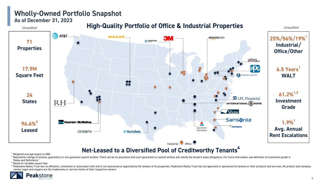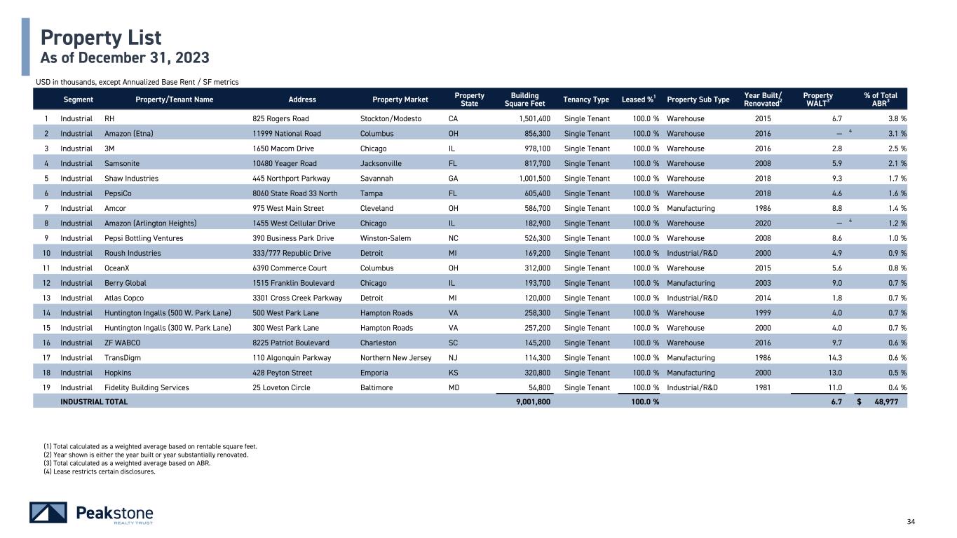 34 USD in thousands, except Annualized Base Rent / SF metrics Segment Property/Tenant Name Address Property Market Property State Building Square Feet Tenancy Type Leased %1 Property Sub Type Year Built/ Renovated2 Property WALT3 % of Total ABR3 1 Industrial RH 825 Rogers Road Stockton/Modesto CA 1,501,400 Single Tenant 100.0 % Warehouse 2015 6.7 3.8 % 2 Industrial Amazon (Etna) 11999 National Road Columbus OH 856,300 Single Tenant 100.0 % Warehouse 2016 — 4 3.1 % 3 Industrial 3M 1650 Macom Drive Chicago IL 978,100 Single Tenant 100.0 % Warehouse 2016 2.8 2.5 % 4 Industrial Samsonite 10480 Yeager Road Jacksonville FL 817,700 Single Tenant 100.0 % Warehouse 2008 5.9 2.1 % 5 Industrial Shaw Industries 445 Northport Parkway Savannah GA 1,001,500 Single Tenant 100.0 % Warehouse 2018 9.3 1.7 % 6 Industrial PepsiCo 8060 State Road 33 North Tampa FL 605,400 Single Tenant 100.0 % Warehouse 2018 4.6 1.6 % 7 Industrial Amcor 975 West Main Street Cleveland OH 586,700 Single Tenant 100.0 % Manufacturing 1986 8.8 1.4 % 8 Industrial Amazon (Arlington Heights) 1455 West Cellular Drive Chicago IL 182,900 Single Tenant 100.0 % Warehouse 2020 — 4 1.2 % 9 Industrial Pepsi Bottling Ventures 390 Business Park Drive Winston-Salem NC 526,300 Single Tenant 100.0 % Warehouse 2008 8.6 1.0 % 10 Industrial Roush Industries 333/777 Republic Drive Detroit MI 169,200 Single Tenant 100.0 % Industrial/R&D 2000 4.9 0.9 % 11 Industrial OceanX 6390 Commerce Court Columbus OH 312,000 Single Tenant 100.0 % Warehouse 2015 5.6 0.8 % 12 Industrial Berry Global 1515 Franklin Boulevard Chicago IL 193,700 Single Tenant 100.0 % Manufacturing 2003 9.0 0.7 % 13 Industrial Atlas Copco 3301 Cross Creek Parkway Detroit MI 120,000 Single Tenant 100.0 % Industrial/R&D 2014 1.8 0.7 % 14 Industrial Huntington Ingalls (500 W. Park Lane) 500 West Park Lane Hampton Roads VA 258,300 Single Tenant 100.0 % Warehouse 1999 4.0 0.7 % 15 Industrial Huntington Ingalls (300 W. Park Lane) 300 West Park Lane Hampton Roads VA 257,200 Single Tenant 100.0 % Warehouse 2000 4.0 0.7 % 16 Industrial ZF WABCO 8225 Patriot Boulevard Charleston SC 145,200 Single Tenant 100.0 % Warehouse 2016 9.7 0.6 % 17 Industrial TransDigm 110 Algonquin Parkway Northern New Jersey NJ 114,300 Single Tenant 100.0 % Manufacturing 1986 14.3 0.6 % 18 Industrial Hopkins 428 Peyton Street Emporia KS 320,800 Single Tenant 100.0 % Manufacturing 2000 13.0 0.5 % 19 Industrial Fidelity Building Services 25 Loveton Circle Baltimore MD 54,800 Single Tenant 100.0 % Industrial/R&D 1981 11.0 0.4 % INDUSTRIAL TOTAL 9,001,800 100.0 % 6.7 $ 48,977 (1) Total calculated as a weighted average based on rentable square feet. (2) Year shown is either the year built or year substantially renovated. (3) Total calculated as a weighted average based on ABR. (4) Lease restricts certain disclosures. Property List As of December 31, 2023