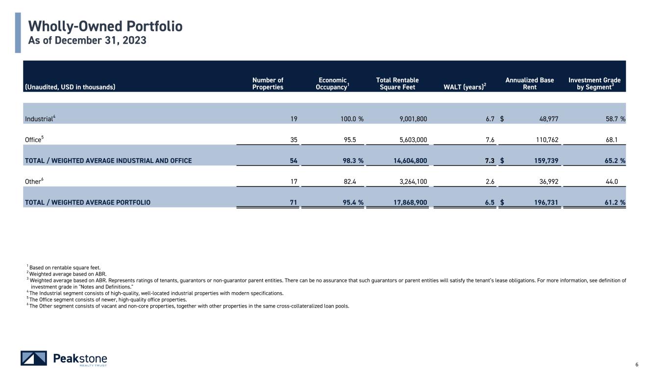 5 High-Quality Portfolio of Office & Industrial Properties Net-Leased to a Diversified Pool of Creditworthy Tenants4 71 Properties 17.9M Square Feet 24 States 96.4%3 Leased 25%/56%/19%1 Industrial/ Office/Other 6.5 Years1 WALT 61.2%1,2 Investment Grade 1.9%1 Avg. Annual Rent Escalations 1 Weighted average based on ABR. 2 Represents ratings of tenants, guarantors or non-guarantor parent entities. There can be no assurance that such guarantors or parent entities will satisfy the tenant’s lease obligations. For more information, see definition of investment grade in "Notes and Definitions." 3 Based on rentable square feet. 4 Peakstone Realty Trust has no affiliation, connection or association with and is not sponsored or approved by the tenants of its properties. Peakstone Realty Trust has not approved or sponsored its tenants or their products and services. All product and company names, logos and slogans are the trademarks or service marks of their respective owners. Industrial Office Wholly-Owned Portfolio Snapshot As of December 31, 2023 Unaudited Unaudited AT&T