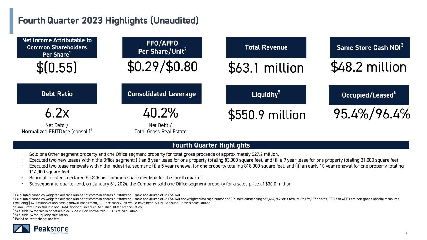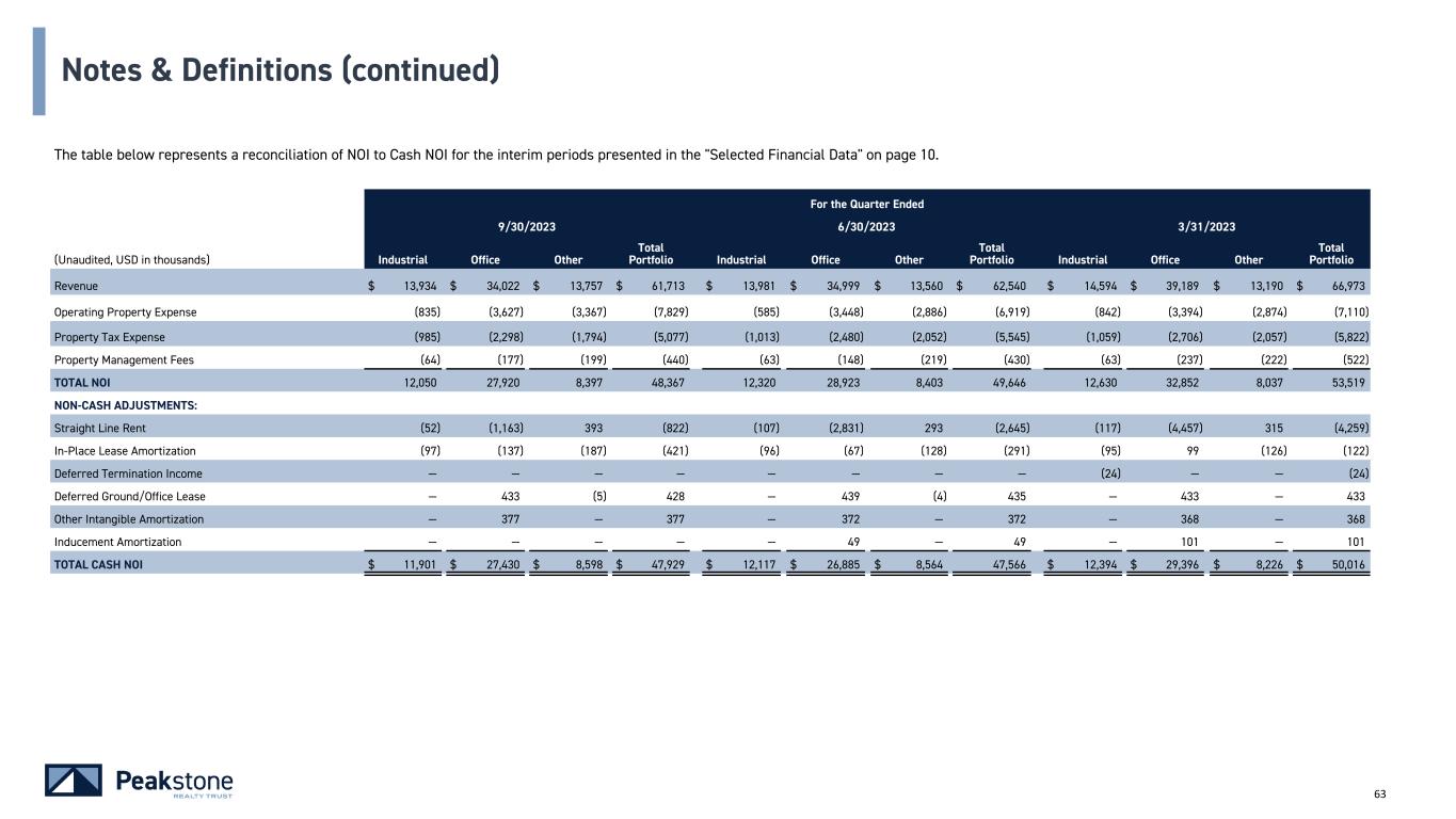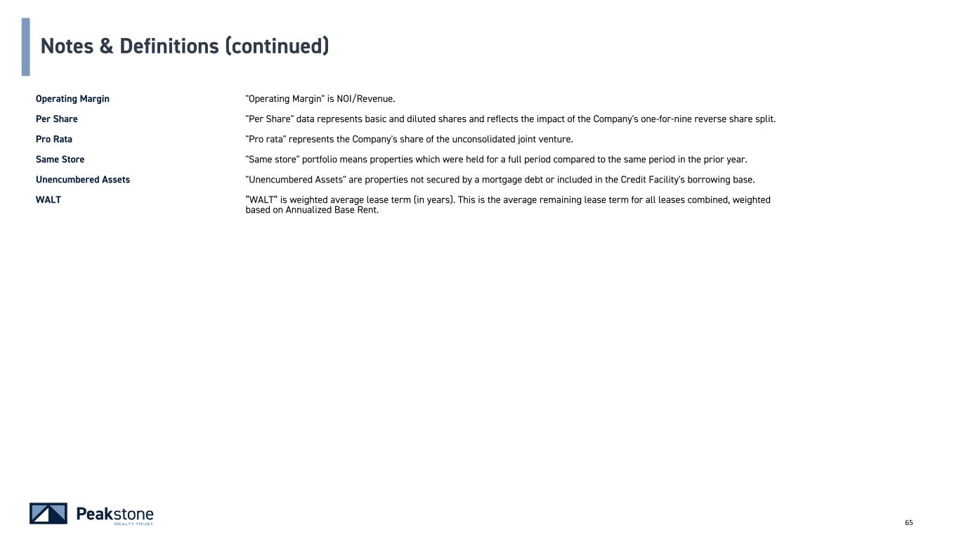 61 Notes & Definitions (continued) FFO and AFFO - cont. Management believes that AFFO is a beneficial indicator of its ongoing portfolio performance and ability to sustain its current distribution level. More specifically, AFFO isolates the financial results of the Company's operations. AFFO, however, is not considered an appropriate measure of historical earnings as it excludes certain significant costs that are otherwise included in reported earnings. Further, since the measure is based on historical financial information, AFFO for the period presented may not be indicative of future results or the Company's future ability to make or sustain distributions. By providing FFO and AFFO, the Company presents information that assists investors in aligning their analysis with management’s analysis of long-term operating activities. For all of these reasons, the Company believes the non-GAAP measures of FFO and AFFO, in addition to net income (loss) are helpful supplemental performance measures and useful to investors in evaluating the performance of the Company's real estate portfolio. However, a material limitation associated with FFO and AFFO is that they are not indicative of the Company's cash available to fund distributions since other uses of cash, such as capital expenditures at the Company's properties and principal payments of debt, are not deducted when calculating FFO and AFFO. The use of AFFO as a measure of long-term operating performance on value is also limited if the Company does not continue to operate under its current business plan as noted above. FFO and AFFO should not be viewed as a more prominent measure of performance than net income (loss) and each should be reviewed in connection with GAAP measurements. Neither the SEC, NAREIT, nor any other applicable regulatory body has opined on the acceptability of the adjustments contemplated to adjust FFO in order to calculate AFFO and its use as a non-GAAP performance measure. In the future, NAREIT may decide to standardize the allowable exclusions across the REIT industry, and the Company may have to adjust the calculation and characterization of this non-GAAP measure. Investment Grade “Investment grade” means an investment grade credit rating from a NRSRO approved by the U.S. Securities and Exchange Commission (e.g., Moody’s Investors Service, Inc., S&P Global Ratings and/or Fitch Ratings Inc.) or a non-NRSRO credit rating (e.g., Bloomberg’s default risk rating) that management believes is generally equivalent to an NRSRO investment grade rating; management can provide no assurance as to the comparability of these ratings methodologies or that any particular rating for a company is indicative of the rating that a single NRSRO would provide in the event that it rated all companies for which the Company provides credit ratings; to the extent such companies are rated only by non-NRSRO ratings providers, such ratings providers may use methodologies that are different and less rigorous than those applied by NRSROs. In the context of Peakstone’s portfolio, references to “investment grade” include, and credit ratings provided by Peakstone may refer to, tenants, guarantors, and non-guarantor parent entities. There can be no assurance that such guarantors or non- guarantor parent entities will satisfy the tenant’s lease obligations, and accordingly, any such credit ratings may not be indicative of the creditworthiness of the Company's tenants. Net Debt “Net Debt” is total consolidated debt less cash and cash equivalents (excluding restricted cash).