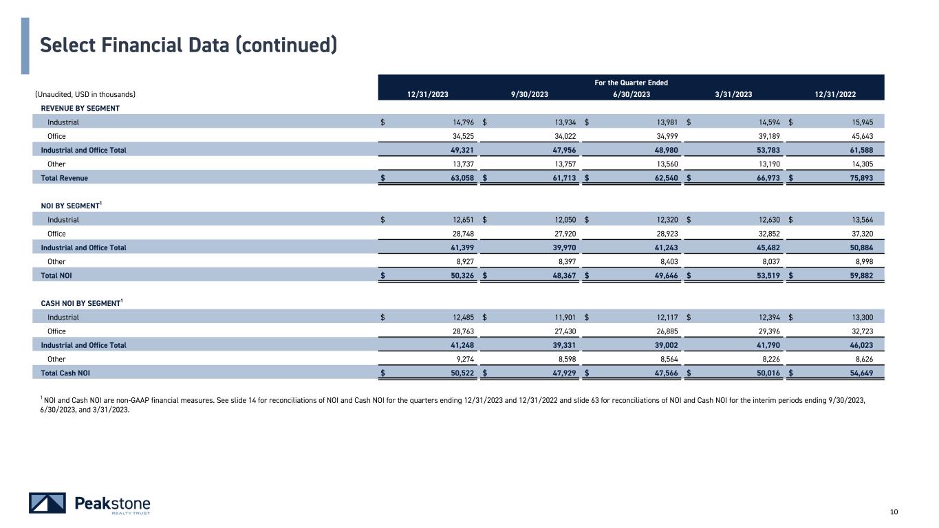 9 1 Calculated based on weighted average number of common shares outstanding - basic and diluted of 36,054,940. 2 Calculated based on weighted average number of common shares outstanding - basic and diluted of 36,054,940 and weighted average number of OP Units outstanding of 3,404,247 for a total of 39,459,187 shares. FFO and AFFO are non-gaap financial measures. Excluding $16.0 million of non-cash goodwill impairment, FFO per share/unit would have been $0.69. See slide 19 for reconciliations. 3 EBITDA is a non-GAAP financial measure. See slide 20 for reconciliations. 4On April 10, 2023, the Company redeemed all issued and outstanding preferred shares (5mm Series A Preferred Shares which were issued to and held by third-party international investors). For the Quarter Ended (Unaudited, USD in thousands, except per share metrics) 12/31/2023 9/30/2023 6/30/2023 3/31/2023 12/31/2022 SELECTED FINANCIAL DATA Net income attributable to common shareholders per share - basic and diluted1 $ (0.55) $ (3.55) $ (11.59) $ 0.17 $ (6.34) FFO per share/unit - basic and diluted2 $ 0.29 $ (2.79) $ (0.27) $ 0.37 $ (3.09) AFFO per share/unit - basic and diluted2 $ 0.80 $ 0.78 $ 0.73 $ 0.68 $ 0.75 Interest expense $ 16,415 $ 16,126 $ 16,068 $ 17,014 $ 16,501 Operating margin 79.8 % 78.4 % 79.4 % 79.9 % 78.9 % Normalized EBITDAre3 $ 42,085 $ 58,297 $ 56,898 $ 58,383 $ 57,924 Adjusted EBITDA3 $ 43,689 $ 41,584 $ 40,095 $ 41,144 $ 42,553 WHOLLY-OWNED PORTFOLIO STATISTICS Rentable Square Feet 17,868,900 18,100,000 18,245,900 18,973,400 19,889,600 Economic Occupancy (based on rentable square feet) 95.4 % 95.9 % 95.4 % 94.6 % 94.8 % Leased (based on rentable square feet) 96.4 % 96.4 % 96.0 % 95.3 % 95.5 % CAPITALIZATION Outstanding Common Shares 36,304,145 35,997,549 35,924,476 36,006,922 35,999,898 Weighted average number of common shares outstanding - basic and diluted 36,054,940 35,975,483 35,922,706 35,999,325 35,999,203 Weighted-average outstanding OP Units 3,404,247 3,482,977 3,528,666 3,537,654 3,537,654 Series A Preferred Shares4 — — — 5,000,000 5,000,000 Total Consolidated Debt $ 1,441,545 $ 1,448,224 $ 1,467,146 $ 1,468,930 $ 1,489,803 Total Cash, Cash Equivalents and Restricted Cash $ 401,010 $ 370,097 $ 363,668 $ 370,209 $ 237,944 Select Financial Data