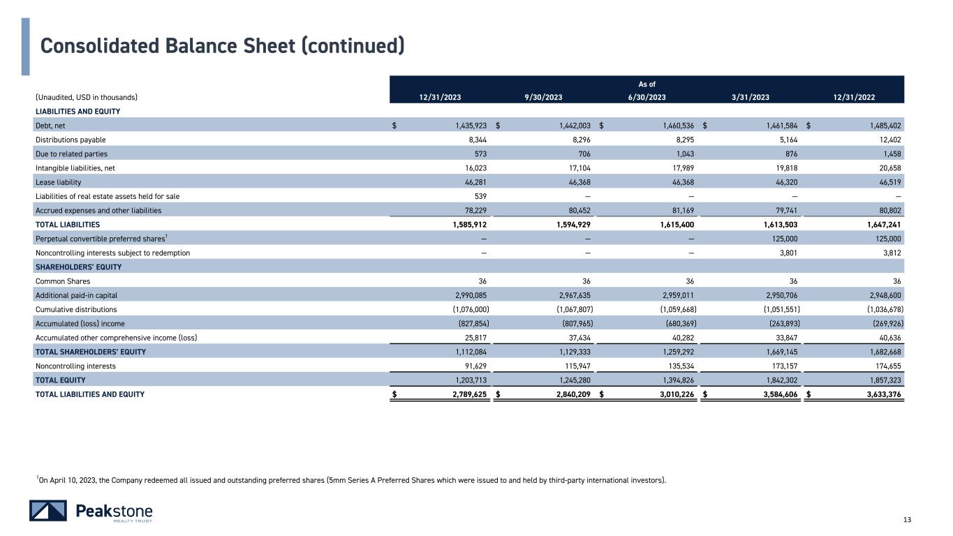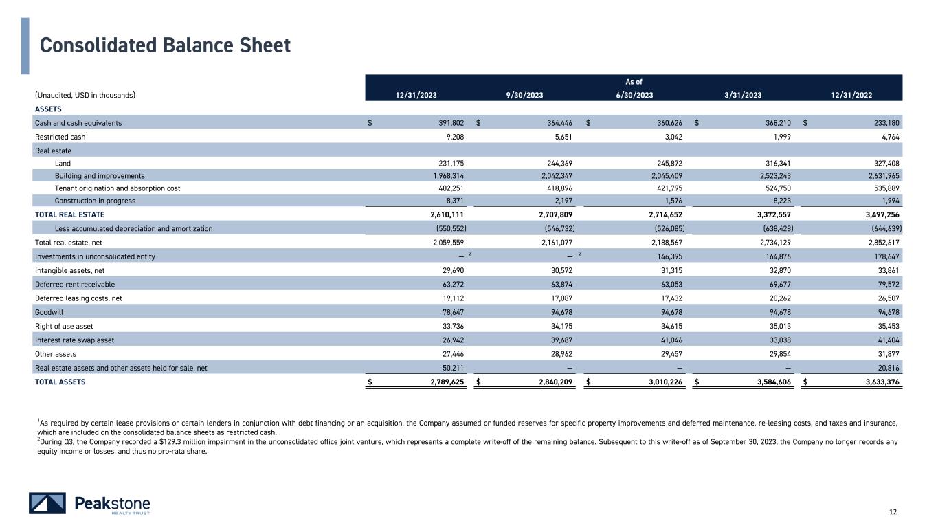 12 As of (Unaudited, USD in thousands) 12/31/2023 9/30/2023 6/30/2023 3/31/2023 12/31/2022 ASSETS Cash and cash equivalents $ 391,802 $ 364,446 $ 360,626 $ 368,210 $ 233,180 Restricted cash1 9,208 5,651 3,042 1,999 4,764 Real estate Land 231,175 244,369 245,872 316,341 327,408 Building and improvements 1,968,314 2,042,347 2,045,409 2,523,243 2,631,965 Tenant origination and absorption cost 402,251 418,896 421,795 524,750 535,889 Construction in progress 8,371 2,197 1,576 8,223 1,994 TOTAL REAL ESTATE 2,610,111 2,707,809 2,714,652 3,372,557 3,497,256 Less accumulated depreciation and amortization (550,552) (546,732) (526,085) (638,428) (644,639) Total real estate, net 2,059,559 2,161,077 2,188,567 2,734,129 2,852,617 Investments in unconsolidated entity — 2 — 2 146,395 164,876 178,647 Intangible assets, net 29,690 30,572 31,315 32,870 33,861 Deferred rent receivable 63,272 63,874 63,053 69,677 79,572 Deferred leasing costs, net 19,112 17,087 17,432 20,262 26,507 Goodwill 78,647 94,678 94,678 94,678 94,678 Right of use asset 33,736 34,175 34,615 35,013 35,453 Interest rate swap asset 26,942 39,687 41,046 33,038 41,404 Other assets 27,446 28,962 29,457 29,854 31,877 Real estate assets and other assets held for sale, net 50,211 — — — 20,816 TOTAL ASSETS $ 2,789,625 $ 2,840,209 $ 3,010,226 $ 3,584,606 $ 3,633,376 Consolidated Balance Sheet 1As required by certain lease provisions or certain lenders in conjunction with debt financing or an acquisition, the Company assumed or funded reserves for specific property improvements and deferred maintenance, re-leasing costs, and taxes and insurance, which are included on the consolidated balance sheets as restricted cash. 2During Q3, the Company recorded a $129.3 million impairment in the unconsolidated office joint venture, which represents a complete write-off of the remaining balance. Subsequent to this write-off as of September 30, 2023, the Company no longer records any equity income or losses, and thus no pro-rata share.
