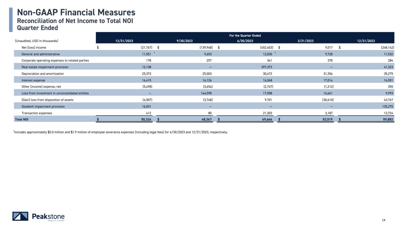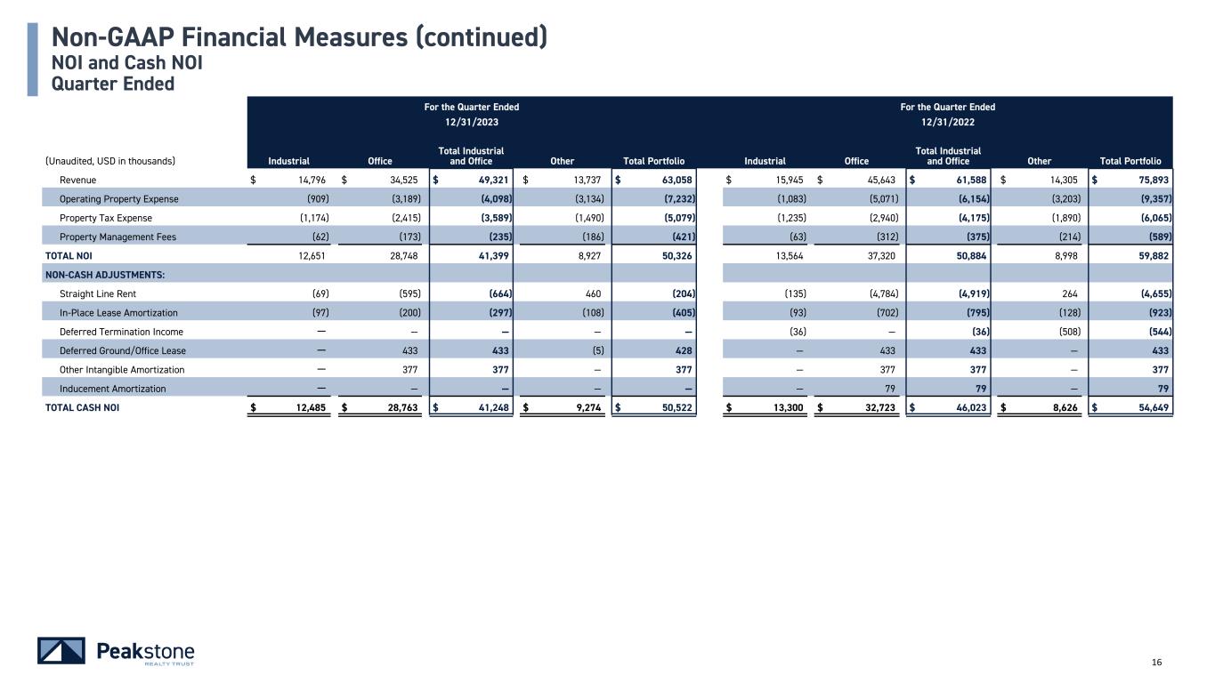 15 For the Year Ended (Unaudited, USD in thousands) 12/31/2023 12/31/2022 Net (loss) income $ (605,102) $ (441,382) General and administrative 42,962 38,995 Corporate operating expenses to related parties 1,154 1,349 Real estate impairment provision 409,512 127,577 Goodwill impairment provision 16,031 135,270 Depreciation and amortization 112,204 190,745 Interest expense 65,623 84,816 Debt breakage costs — 13,249 Other (income) expense, net (13,111) 943 Loss from investment in unconsolidated entities 176,767 9,993 (Gain) loss from disposition of assets (29,164) 139,280 Transaction expenses 24,982 22,386 Total NOI $ 201,858 $ 323,221 Non-GAAP Financial Measures Reconciliation of Net Income to Total NOI Year Ended