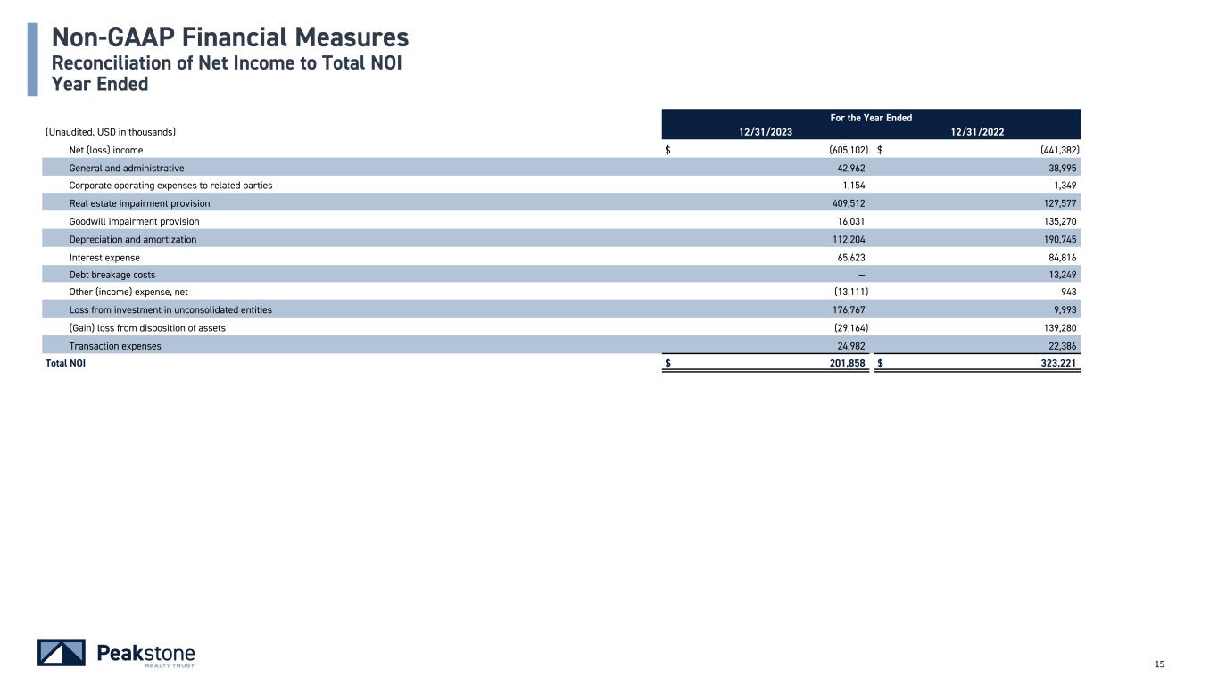 14 For the Quarter Ended (Unaudited, USD in thousands) 12/31/2023 9/30/2023 6/30/2023 3/31/2023 12/31/2022 Net (loss) income $ (21,767) $ (139,948) $ (452,403) $ 9,017 $ (248,142) General and administrative 11,551 1 9,653 12,030 1 9,728 11,532 Corporate operating expenses to related parties 178 257 341 378 284 Real estate impairment provision 12,138 — 397,373 — 41,323 Depreciation and amortization 25,373 25,003 30,472 31,356 35,275 Interest expense 16,415 16,126 16,068 17,014 16,501 Other (income) expense, net (5,498) (3,654) (2,747) (1,212) 355 Loss from investment in unconsolidated entities — 144,598 17,508 14,661 9,993 (Gain) loss from disposition of assets (4,507) (3,748) 9,701 (30,610) 43,767 Goodwill impairment provision 16,031 — — — 135,270 Transaction expenses 412 80 21,303 3,187 13,724 Total NOI $ 50,326 $ 48,367 $ 49,646 $ 53,519 $ 59,882 Non-GAAP Financial Measures Reconciliation of Net Income to Total NOI Quarter Ended 1Includes approximately $2.0 million and $1.9 million of employee severance expenses (including legal fees) for 6/30/2023 and 12/31/2023, respectively.