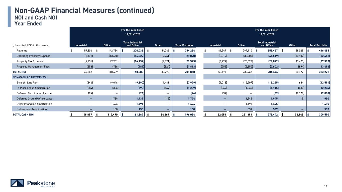 16 For the Quarter Ended For the Quarter Ended 12/31/2023 12/31/2022 (Unaudited, USD in thousands) Industrial Office Total Industrial and Office Other Total Portfolio Industrial Office Total Industrial and Office Other Total Portfolio Revenue $ 14,796 $ 34,525 $ 49,321 $ 13,737 $ 63,058 $ 15,945 $ 45,643 $ 61,588 $ 14,305 $ 75,893 Operating Property Expense (909) (3,189) (4,098) (3,134) (7,232) (1,083) (5,071) (6,154) (3,203) (9,357) Property Tax Expense (1,174) (2,415) (3,589) (1,490) (5,079) (1,235) (2,940) (4,175) (1,890) (6,065) Property Management Fees (62) (173) (235) (186) (421) (63) (312) (375) (214) (589) TOTAL NOI 12,651 28,748 41,399 8,927 50,326 13,564 37,320 50,884 8,998 59,882 NON-CASH ADJUSTMENTS: Straight Line Rent (69) (595) (664) 460 (204) (135) (4,784) (4,919) 264 (4,655) In-Place Lease Amortization (97) (200) (297) (108) (405) (93) (702) (795) (128) (923) Deferred Termination Income — — — — — (36) — (36) (508) (544) Deferred Ground/Office Lease — 433 433 (5) 428 — 433 433 — 433 Other Intangible Amortization — 377 377 — 377 — 377 377 — 377 Inducement Amortization — — — — — — 79 79 — 79 TOTAL CASH NOI $ 12,485 $ 28,763 $ 41,248 $ 9,274 $ 50,522 $ 13,300 $ 32,723 $ 46,023 $ 8,626 $ 54,649 Non-GAAP Financial Measures (continued) NOI and Cash NOI Quarter Ended