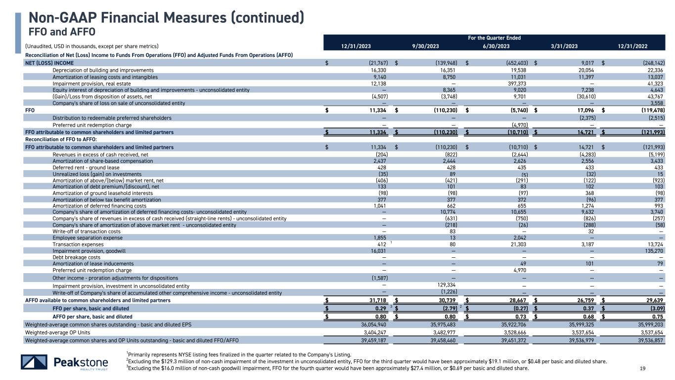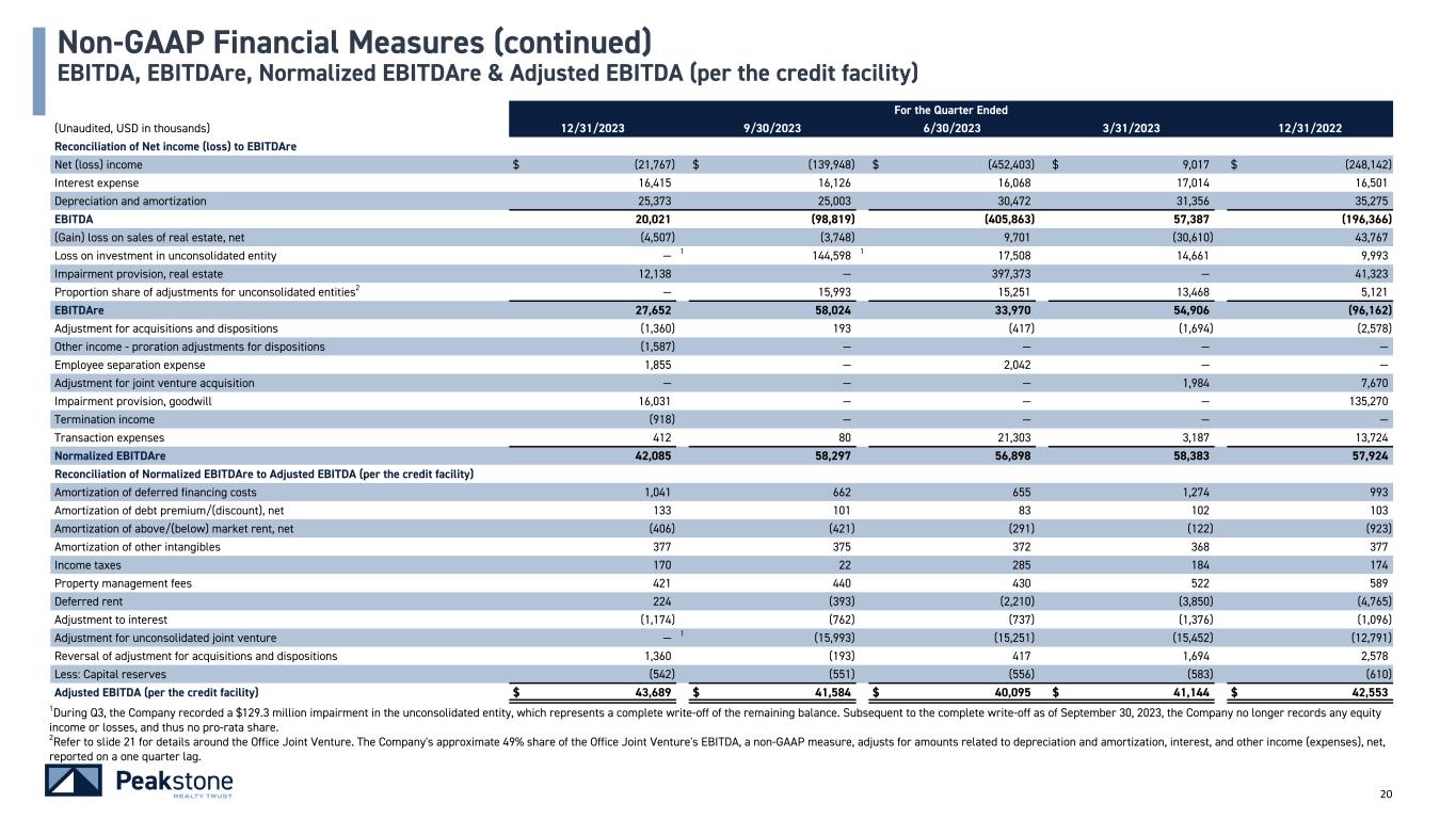 19 For the Quarter Ended (Unaudited, USD in thousands, except per share metrics) 12/31/2023 9/30/2023 6/30/2023 3/31/2023 12/31/2022 Reconciliation of Net (Loss) Income to Funds From Operations (FFO) and Adjusted Funds From Operations (AFFO) NET (LOSS) INCOME $ (21,767) $ (139,948) $ (452,403) $ 9,017 $ (248,142) Depreciation of building and improvements 16,330 16,351 19,538 20,054 22,336 Amortization of leasing costs and intangibles 9,140 8,750 11,031 11,397 13,037 Impairment provision, real estate 12,138 — 397,373 — 41,323 Equity interest of depreciation of building and improvements - unconsolidated entity — 8,365 9,020 7,238 4,643 (Gain)/Loss from disposition of assets, net (4,507) (3,748) 9,701 (30,610) 43,767 Company's share of loss on sale of unconsolidated entity — — — — 3,558 FFO $ 11,334 $ (110,230) $ (5,740) $ 17,096 $ (119,478) Distribution to redeemable preferred shareholders — — — (2,375) (2,515) Preferred unit redemption charge — — (4,970) — — FFO attributable to common shareholders and limited partners $ 11,334 $ (110,230) $ (10,710) $ 14,721 $ (121,993) Reconciliation of FFO to AFFO: FFO attributable to common shareholders and limited partners $ 11,334 $ (110,230) $ (10,710) $ 14,721 $ (121,993) Revenues in excess of cash received, net (204) (822) (2,644) (4,283) (5,199) Amortization of share-based compensation 2,437 2,444 2,626 2,556 3,433 Deferred rent - ground lease 428 428 435 433 433 Unrealized loss (gain) on investments (35) 89 (5) (32) 15 Amortization of above/(below) market rent, net (406) (421) (291) (122) (923) Amortization of debt premium/(discount), net 133 101 83 102 103 Amortization of ground leasehold interests (98) (98) (97) 368 (98) Amortization of below tax benefit amortization 377 377 372 (96) 377 Amortization of deferred financing costs 1,041 662 655 1,274 993 Company's share of amortization of deferred financing costs- unconsolidated entity — 10,774 10,655 9,632 3,740 Company's share of revenues in excess of cash received (straight-line rents) - unconsolidated entity — (631) (750) (826) (257) Company's share of amortization of above market rent - unconsolidated entity — (218) (26) (288) (58) Write-off of transaction costs — 83 — 32 — Employee separation expense 1,855 13 2,042 — — Transaction expenses 412 1 80 21,303 3,187 13,724 Impairment provision, goodwill 16,031 — — — 135,270 Debt breakage costs — — — — — Amortization of lease inducements — — 49 101 79 Preferred unit redemption charge — — 4,970 — — Other income - proration adjustments for dispositions (1,587) — — — — Impairment provision, investment in unconsolidated entity — 129,334 — — — Write-off of Company's share of accumulated other comprehensive income - unconsolidated entity — (1,226) — — — AFFO available to common shareholders and limited partners $ 31,718 $ 30,739 $ 28,667 $ 26,759 $ 29,639 FFO per share, basic and diluted $ 0.29 3 $ (2.79) 2 $ (0.27) $ 0.37 $ (3.09) AFFO per share, basic and diluted $ 0.80 $ 0.80 $ 0.73 $ 0.68 $ 0.75 Weighted-average common shares outstanding - basic and diluted EPS 36,054,940 35,975,483 35,922,706 35,999,325 35,999,203 Weighted-average OP Units 3,404,247 3,482,977 3,528,666 3,537,654 3,537,654 Weighted-average common shares and OP Units outstanding - basic and diluted FFO/AFFO 39,459,187 39,458,460 39,451,372 39,536,979 39,536,857 Non-GAAP Financial Measures (continued) FFO and AFFO 1Primarily represents NYSE listing fees finalized in the quarter related to the Company's Listing. 2Excluding the $129.3 million of non-cash impairment of the investment in unconsolidated entity, FFO for the third quarter would have been approximately $19.1 million, or $0.48 per basic and diluted share. 3Excluding the $16.0 million of non-cash goodwill impairment, FFO for the fourth quarter would have been approximately $27.4 million, or $0.69 per basic and diluted share.