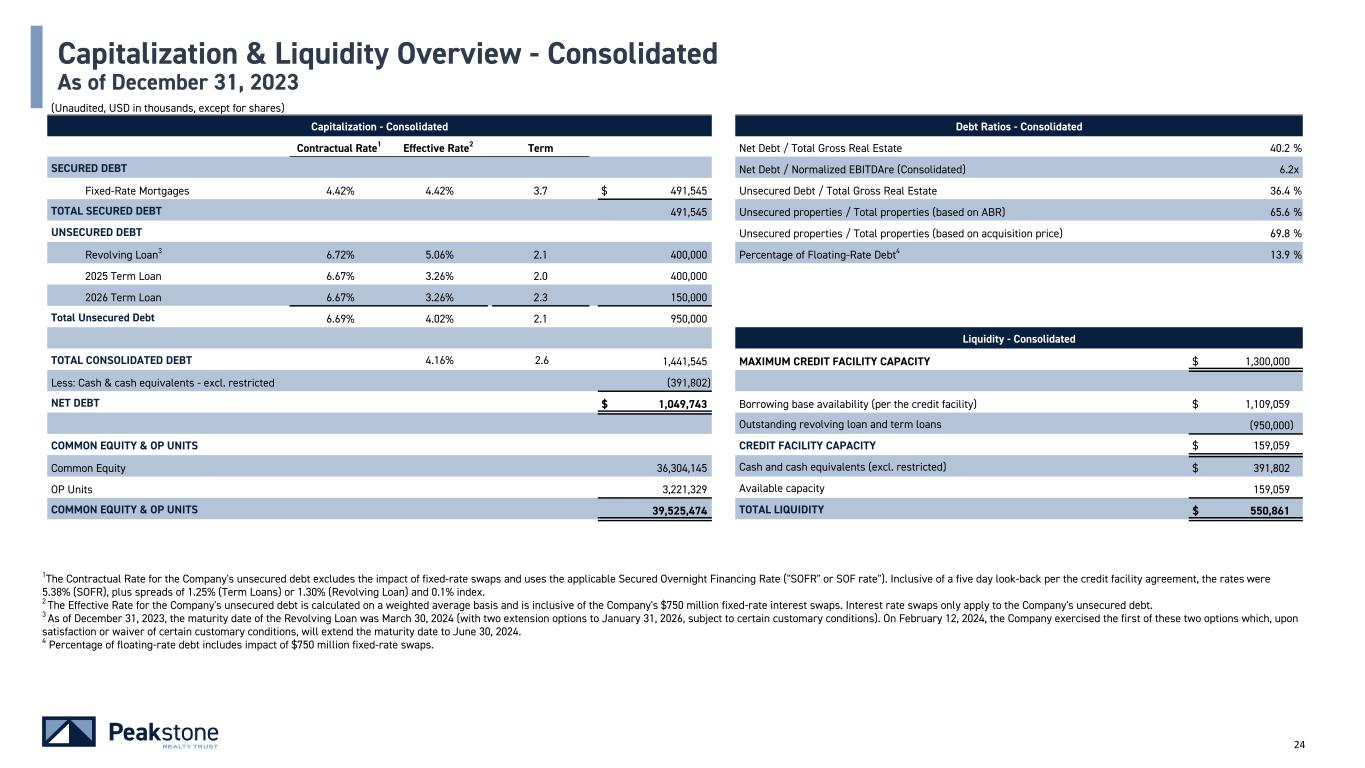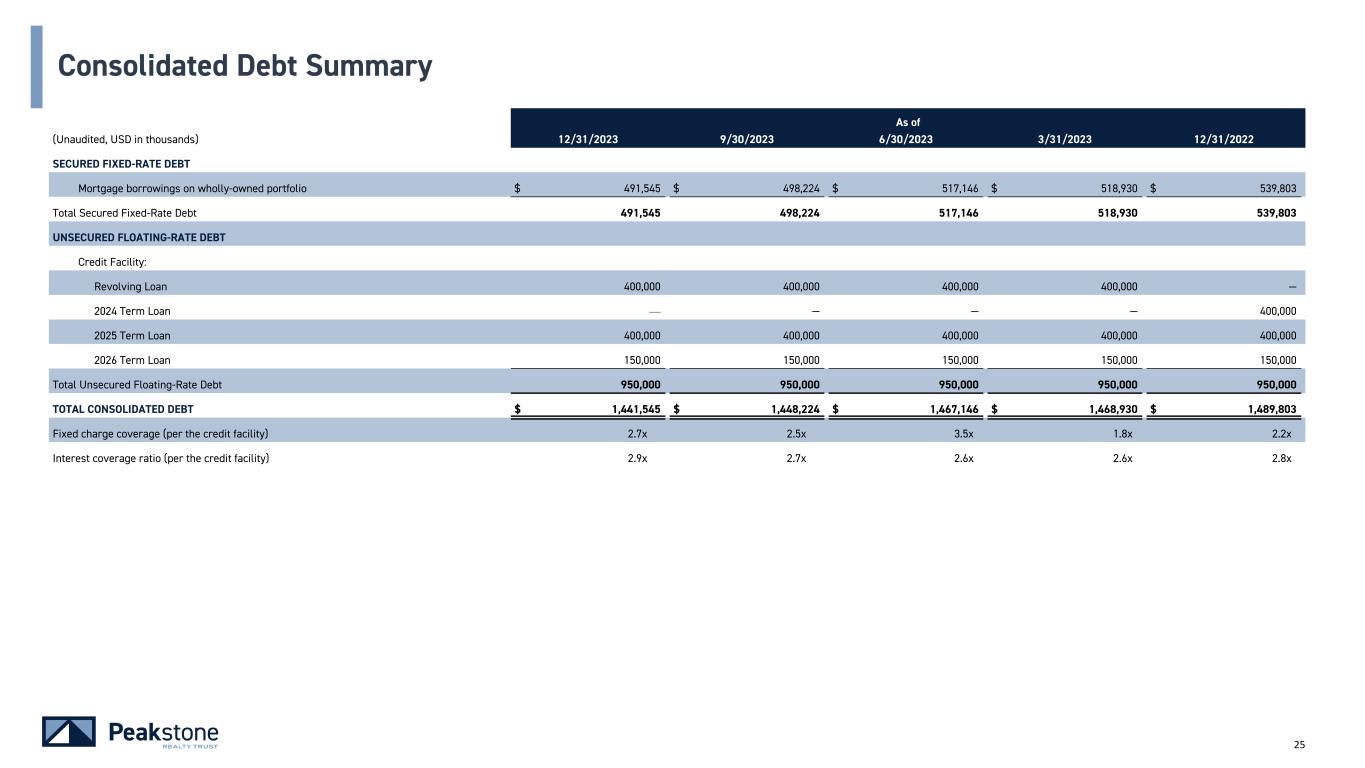 24 1The Contractual Rate for the Company's unsecured debt excludes the impact of fixed-rate swaps and uses the applicable Secured Overnight Financing Rate ("SOFR" or SOF rate"). Inclusive of a five day look-back per the credit facility agreement, the rates were 5.38% (SOFR), plus spreads of 1.25% (Term Loans) or 1.30% (Revolving Loan) and 0.1% index. 2 The Effective Rate for the Company's unsecured debt is calculated on a weighted average basis and is inclusive of the Company's $750 million fixed-rate interest swaps. Interest rate swaps only apply to the Company's unsecured debt. 3 As of December 31, 2023, the maturity date of the Revolving Loan was March 30, 2024 (with two extension options to January 31, 2026, subject to certain customary conditions). On February 12, 2024, the Company exercised the first of these two options which, upon satisfaction or waiver of certain customary conditions, will extend the maturity date to June 30, 2024. 4 Percentage of floating-rate debt includes impact of $750 million fixed-rate swaps. (Unaudited, USD in thousands, except for shares) Capitalization - Consolidated Debt Ratios - Consolidated Contractual Rate1 Effective Rate2 Term Net Debt / Total Gross Real Estate 40.2 % SECURED DEBT Net Debt / Normalized EBITDAre (Consolidated) 6.2x Fixed-Rate Mortgages 4.42% 4.42% 3.7 $ 491,545 Unsecured Debt / Total Gross Real Estate 36.4 % TOTAL SECURED DEBT 491,545 Unsecured properties / Total properties (based on ABR) 65.6 % UNSECURED DEBT Unsecured properties / Total properties (based on acquisition price) 69.8 % Revolving Loan3 6.72% 5.06% 2.1 400,000 Percentage of Floating-Rate Debt4 13.9 % 2025 Term Loan 6.67% 3.26% 2.0 400,000 2026 Term Loan 6.67% 3.26% 2.3 150,000 Total Unsecured Debt 6.69% 4.02% 2.1 950,000 Liquidity - Consolidated TOTAL CONSOLIDATED DEBT 4.16% 2.6 1,441,545 MAXIMUM CREDIT FACILITY CAPACITY $ 1,300,000 Less: Cash & cash equivalents - excl. restricted (391,802) NET DEBT $ 1,049,743 Borrowing base availability (per the credit facility) $ 1,109,059 Outstanding revolving loan and term loans (950,000) COMMON EQUITY & OP UNITS CREDIT FACILITY CAPACITY $ 159,059 Common Equity 36,304,145 Cash and cash equivalents (excl. restricted) $ 391,802 OP Units 3,221,329 Available capacity 159,059 COMMON EQUITY & OP UNITS 39,525,474 TOTAL LIQUIDITY $ 550,861 Capitalization & Liquidity Overview - Consolidated As of December 31, 2023