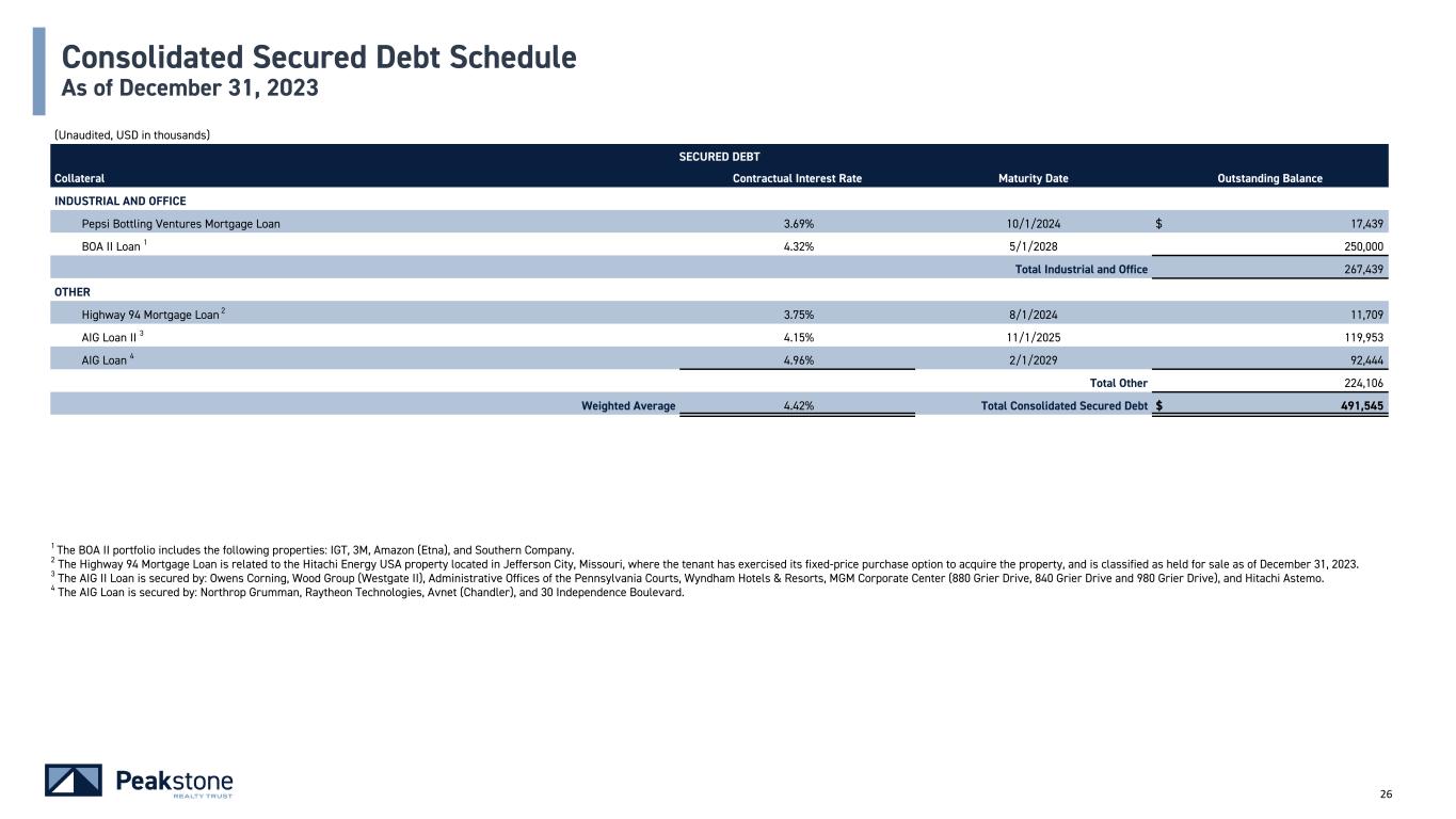 26 (Unaudited, USD in thousands) SECURED DEBT Collateral Contractual Interest Rate Maturity Date Outstanding Balance INDUSTRIAL AND OFFICE Pepsi Bottling Ventures Mortgage Loan 3.69% 10/1/2024 $ 17,439 BOA II Loan 1 4.32% 5/1/2028 250,000 Total Industrial and Office 267,439 OTHER Highway 94 Mortgage Loan 2 3.75% 8/1/2024 11,709 AIG Loan II 3 4.15% 11/1/2025 119,953 AIG Loan 4 4.96% 2/1/2029 92,444 Total Other 224,106 Weighted Average 4.42% Total Consolidated Secured Debt $ 491,545 1 The BOA II portfolio includes the following properties: IGT, 3M, Amazon (Etna), and Southern Company. 2 The Highway 94 Mortgage Loan is related to the Hitachi Energy USA property located in Jefferson City, Missouri, where the tenant has exercised its fixed-price purchase option to acquire the property, and is classified as held for sale as of December 31, 2023. 3 The AIG II Loan is secured by: Owens Corning, Wood Group (Westgate II), Administrative Offices of the Pennsylvania Courts, Wyndham Hotels & Resorts, MGM Corporate Center (880 Grier Drive, 840 Grier Drive and 980 Grier Drive), and Hitachi Astemo. 4 The AIG Loan is secured by: Northrop Grumman, Raytheon Technologies, Avnet (Chandler), and 30 Independence Boulevard. Consolidated Secured Debt Schedule As of December 31, 2023