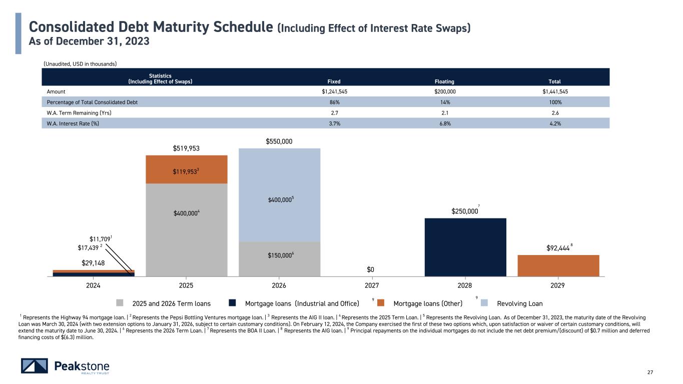 27 1 Represents the Highway 94 mortgage loan. | 2 Represents the Pepsi Bottling Ventures mortgage loan. | 3 Represents the AIG II loan. | 4 Represents the 2025 Term Loan. | 5 Represents the Revolving Loan. As of December 31, 2023, the maturity date of the Revolving Loan was March 30, 2024 (with two extension options to January 31, 2026, subject to certain customary conditions). On February 12, 2024, the Company exercised the first of these two options which, upon satisfaction or waiver of certain customary conditions, will extend the maturity date to June 30, 2024. | 6 Represents the 2026 Term Loan. | 7 Represents the BOA II Loan. | 8 Represents the AIG loan. | 9 Principal repayments on the individual mortgages do not include the net debt premium/(discount) of $0.7 million and deferred financing costs of $(6.3) million. $141,194(1) $200,000(3) $400,000(5) $29,148 $519,953 $550,000 $250,000 $92,444 2025 and 2026 Term loans Mortgage loans (Industrial and Office) Mortgage loans (Other) Revolving Loan 2024 2025 2026 2027 2028 2029 (Unaudited, USD in thousands) Statistics (Including Effect of Swaps) Fixed Floating Total Amount $1,241,545 $200,000 $1,441,545 Percentage of Total Consolidated Debt 86% 14% 100% W.A. Term Remaining (Yrs) 2.7 2.1 2.6 W.A. Interest Rate (%) 3.7% 6.8% 4.2% (1) 7 8 $119,9533 $400,0004 $17,439 2 $11,7091 Consolidated Debt Maturity Schedule (Including Effect of Interest Rate Swaps) As of December 31, 2023 $150,0006 $400,0005 9 9 $0