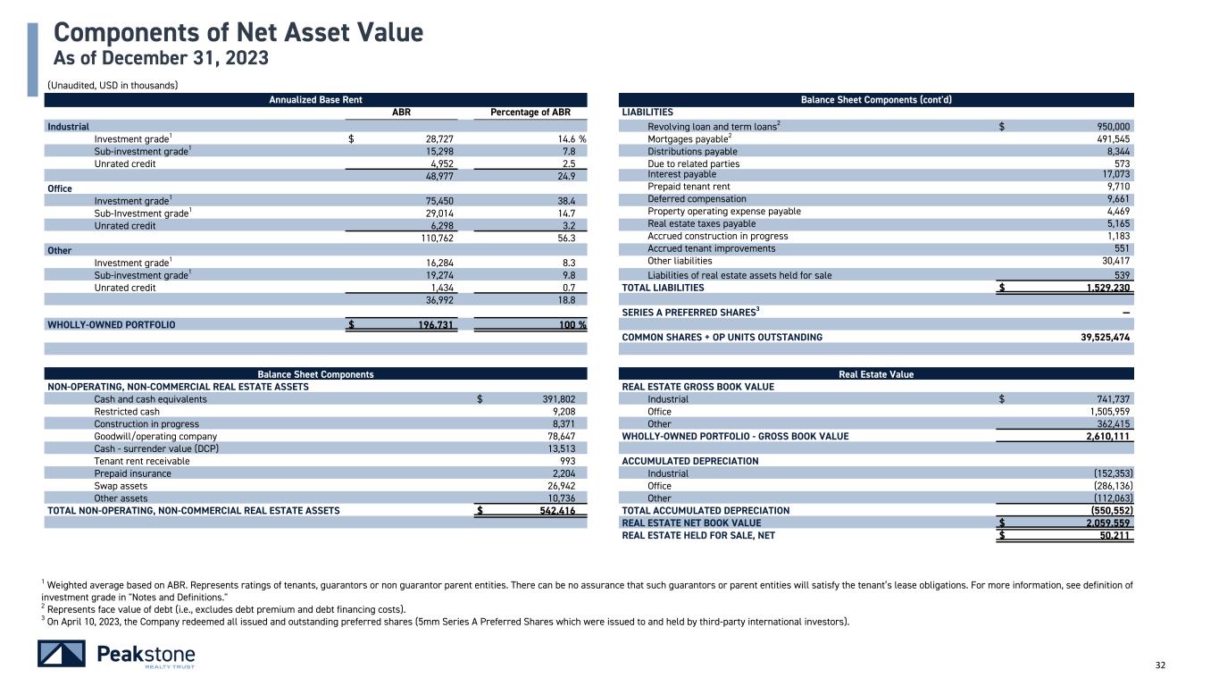 32 (Unaudited, USD in thousands) Annualized Base Rent Balance Sheet Components (cont'd) ABR Percentage of ABR LIABILITIES Industrial Revolving loan and term loans2 $ 950,000 Investment grade1 $ 28,727 14.6 % Mortgages payable2 491,545 Sub-investment grade1 15,298 7.8 Distributions payable 8,344 Unrated credit 4,952 2.5 Due to related parties 573 48,977 24.9 Interest payable 17,073 Office Prepaid tenant rent 9,710 Investment grade1 75,450 38.4 Deferred compensation 9,661 Sub-Investment grade1 29,014 14.7 Property operating expense payable 4,469 Unrated credit 6,298 3.2 Real estate taxes payable 5,165 110,762 56.3 Accrued construction in progress 1,183 Other Accrued tenant improvements 551 Investment grade1 16,284 8.3 Other liabilities 30,417 Sub-investment grade1 19,274 9.8 Liabilities of real estate assets held for sale 539 Unrated credit 1,434 0.7 TOTAL LIABILITIES $ 1,529,230 36,992 18.8 SERIES A PREFERRED SHARES3 — WHOLLY-OWNED PORTFOLIO $ 196,731 100 % COMMON SHARES + OP UNITS OUTSTANDING 39,525,474 Balance Sheet Components Real Estate Value NON-OPERATING, NON-COMMERCIAL REAL ESTATE ASSETS REAL ESTATE GROSS BOOK VALUE Cash and cash equivalents $ 391,802 Industrial $ 741,737 Restricted cash 9,208 Office 1,505,959 Construction in progress 8,371 Other 362,415 Goodwill/operating company 78,647 WHOLLY-OWNED PORTFOLIO - GROSS BOOK VALUE 2,610,111 Cash - surrender value (DCP) 13,513 Tenant rent receivable 993 ACCUMULATED DEPRECIATION Prepaid insurance 2,204 Industrial (152,353) Swap assets 26,942 Office (286,136) Other assets 10,736 Other (112,063) TOTAL NON-OPERATING, NON-COMMERCIAL REAL ESTATE ASSETS $ 542,416 TOTAL ACCUMULATED DEPRECIATION (550,552) REAL ESTATE NET BOOK VALUE $ 2,059,559 REAL ESTATE HELD FOR SALE, NET $ 50,211 Components of Net Asset Value As of December 31, 2023 1 Weighted average based on ABR. Represents ratings of tenants, guarantors or non guarantor parent entities. There can be no assurance that such guarantors or parent entities will satisfy the tenant’s lease obligations. For more information, see definition of investment grade in "Notes and Definitions." 2 Represents face value of debt (i.e., excludes debt premium and debt financing costs). 3 On April 10, 2023, the Company redeemed all issued and outstanding preferred shares (5mm Series A Preferred Shares which were issued to and held by third-party international investors).