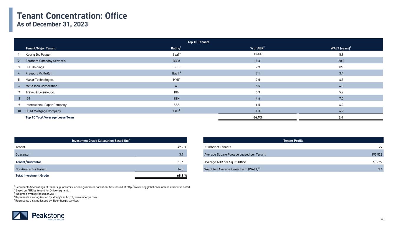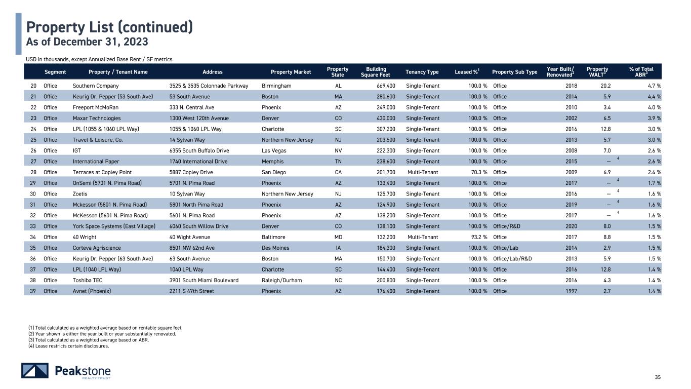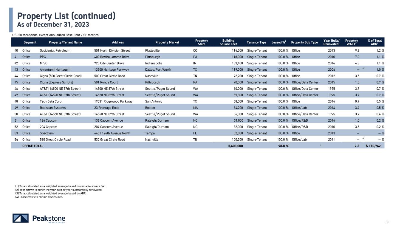 35 USD in thousands, except Annualized Base Rent / SF metrics Segment Property / Tenant Name Address Property Market Property State Building Square Feet Tenancy Type Leased %1 Property Sub Type Year Built/ Renovated2 Property WALT3 % of Total ABR3 20 Office Southern Company 3525 & 3535 Colonnade Parkway Birmingham AL 669,400 Single-Tenant 100.0 % Office 2018 20.2 4.7 % 21 Office Keurig Dr. Pepper (53 South Ave) 53 South Avenue Boston MA 280,600 Single-Tenant 100.0 % Office 2014 5.9 4.4 % 22 Office Freeport McMoRan 333 N. Central Ave Phoenix AZ 249,000 Single-Tenant 100.0 % Office 2010 3.4 4.0 % 23 Office Maxar Technologies 1300 West 120th Avenue Denver CO 430,000 Single-Tenant 100.0 % Office 2002 6.5 3.9 % 24 Office LPL (1055 & 1060 LPL Way) 1055 & 1060 LPL Way Charlotte SC 307,200 Single-Tenant 100.0 % Office 2016 12.8 3.0 % 25 Office Travel & Leisure, Co. 14 Sylvan Way Northern New Jersey NJ 203,500 Single-Tenant 100.0 % Office 2013 5.7 3.0 % 26 Office IGT 6355 South Buffalo Drive Las Vegas NV 222,300 Single-Tenant 100.0 % Office 2008 7.0 2.6 % 27 Office International Paper 1740 International Drive Memphis TN 238,600 Single-Tenant 100.0 % Office 2015 — 4 2.6 % 28 Office Terraces at Copley Point 5887 Copley Drive San Diego CA 201,700 Multi-Tenant 70.3 % Office 2009 6.9 2.4 % 29 Office OnSemi (5701 N. Pima Road) 5701 N. Pima Road Phoenix AZ 133,400 Single-Tenant 100.0 % Office 2017 — 4 1.7 % 30 Office Zoetis 10 Sylvan Way Northern New Jersey NJ 125,700 Single-Tenant 100.0 % Office 2016 — 4 1.6 % 31 Office Mckesson (5801 N. Pima Road) 5801 North Pima Road Phoenix AZ 124,900 Single-Tenant 100.0 % Office 2019 — 4 1.6 % 32 Office McKesson (5601 N. Pima Road) 5601 N. Pima Road Phoenix AZ 138,200 Single-Tenant 100.0 % Office 2017 — 4 1.6 % 33 Office York Space Systems (East Village) 6060 South Willow Drive Denver CO 138,100 Single-Tenant 100.0 % Office/R&D 2020 8.0 1.5 % 34 Office 40 Wright 40 Wight Avenue Baltimore MD 132,200 Multi-Tenant 93.2 % Office 2017 8.8 1.5 % 35 Office Corteva Agriscience 8501 NW 62nd Ave Des Moines IA 184,300 Single-Tenant 100.0 % Office/Lab 2014 2.9 1.5 % 36 Office Keurig Dr. Pepper (63 South Ave) 63 South Avenue Boston MA 150,700 Single-Tenant 100.0 % Office/Lab/R&D 2013 5.9 1.5 % 37 Office LPL (1040 LPL Way) 1040 LPL Way Charlotte SC 144,400 Single-Tenant 100.0 % Office 2016 12.8 1.4 % 38 Office Toshiba TEC 3901 South Miami Boulevard Raleigh/Durham NC 200,800 Single-Tenant 100.0 % Office 2016 4.3 1.4 % 39 Office Avnet (Phoenix) 2211 S 47th Street Phoenix AZ 176,400 Single-Tenant 100.0 % Office 1997 2.7 1.4 % Property List (continued) As of December 31, 2023 (1) Total calculated as a weighted average based on rentable square feet. (2) Year shown is either the year built or year substantially renovated. (3) Total calculated as a weighted average based on ABR. (4) Lease restricts certain disclosures.