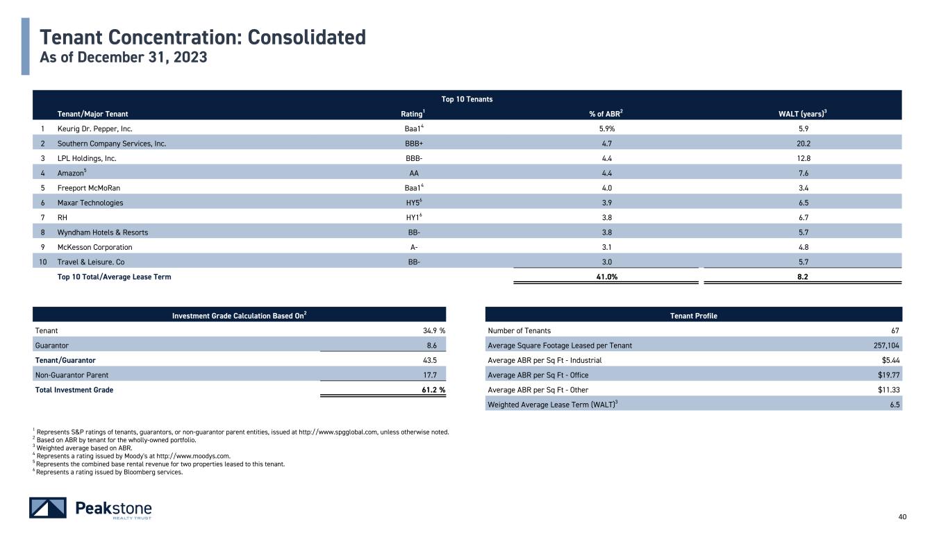 40 Top 10 Tenants Tenant/Major Tenant Rating1 % of ABR2 WALT (years)3 1 Keurig Dr. Pepper, Inc. Baa14 5.9% 5.9 2 Southern Company Services, Inc. BBB+ 4.7 20.2 3 LPL Holdings, Inc. BBB- 4.4 12.8 4 Amazon5 AA 4.4 7.6 5 Freeport McMoRan Baa14 4.0 3.4 6 Maxar Technologies HY56 3.9 6.5 7 RH HY16 3.8 6.7 8 Wyndham Hotels & Resorts BB- 3.8 5.7 9 McKesson Corporation A- 3.1 4.8 10 Travel & Leisure. Co BB- 3.0 5.7 Top 10 Total/Average Lease Term 41.0% 8.2 Investment Grade Calculation Based On2 Tenant Profile Tenant 34.9 % Number of Tenants 67 Guarantor 8.6 Average Square Footage Leased per Tenant 257,104 Tenant/Guarantor 43.5 Average ABR per Sq Ft - Industrial $5.44 Non-Guarantor Parent 17.7 Average ABR per Sq Ft - Office $19.77 Total Investment Grade 61.2 % Average ABR per Sq Ft - Other $11.33 Weighted Average Lease Term (WALT)3 6.5 Tenant Concentration: Consolidated As of December 31, 2023 1 Represents S&P ratings of tenants, guarantors, or non-guarantor parent entities, issued at http://www.spgglobal.com, unless otherwise noted. 2 Based on ABR by tenant for the wholly-owned portfolio. 3 Weighted average based on ABR. 4 Represents a rating issued by Moody's at http://www.moodys.com. 5 Represents the combined base rental revenue for two properties leased to this tenant. 6 Represents a rating issued by Bloomberg services.