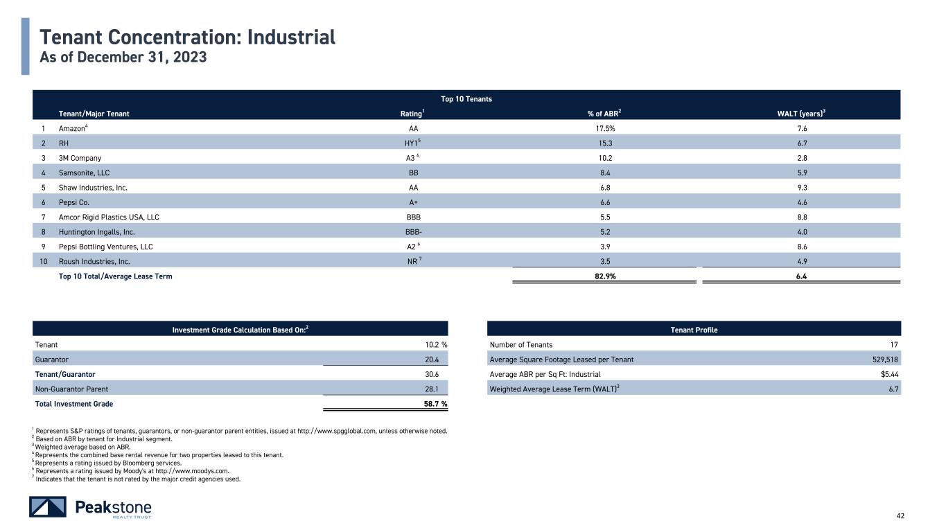 41 Top 10 Tenants Tenant/Major Tenant Rating1 % of ABR2 WALT (years)3 1 Keurig Dr. Pepper, Inc. Baa14 7.2% 5.9 2 Southern Company Services, Inc. BBB+ 5.8 20.2 3 LPL Holdings, Inc. BBB- 5.4 12.8 4 Amazon5 AA 5.4 7.6 5 Freeport McMoRan Baa14 4.9 3.4 6 Maxar Technologies HY56 4.8 6.5 7 RH HY16 4.7 6.7 8 McKesson Corporation A- 3.8 4.8 9 Travel & Leisure, Co. BB- 3.6 5.7 10 IGT BB+ 3.2 7.0 Top 10 Total/Average Lease Term 48.8% 8.4 Investment Grade Calculation Based On:2 Tenant Profile Tenant 36.4 % Number of Tenants 46 Guarantor 8.8 Average Square Footage Leased per Tenant 315,996 Tenant/Guarantor 45.2 Average ABR per Sq Ft: Industrial and Office $10.94 Non-Guarantor Parent 20.0 Weighted Average Lease Term (WALT)3 7.3 Total Investment Grade 65.2 % Tenant Concentration: Industrial and Office As of December 31, 2023 1 Represents S&P ratings of tenants, guarantors, or non-guarantor parent entities, issued at http://www.spgglobal.com, unless otherwise noted. 2 Based on ABR by tenant for Industrial and Office segments. 3 Weighted average based on ABR. 4 Represents a rating issued by Moody's at http://www.moodys.com. 5 Represents the combined base rental revenue for two properties leased to this tenant. 6 Represents a rating issued by Bloomberg services.