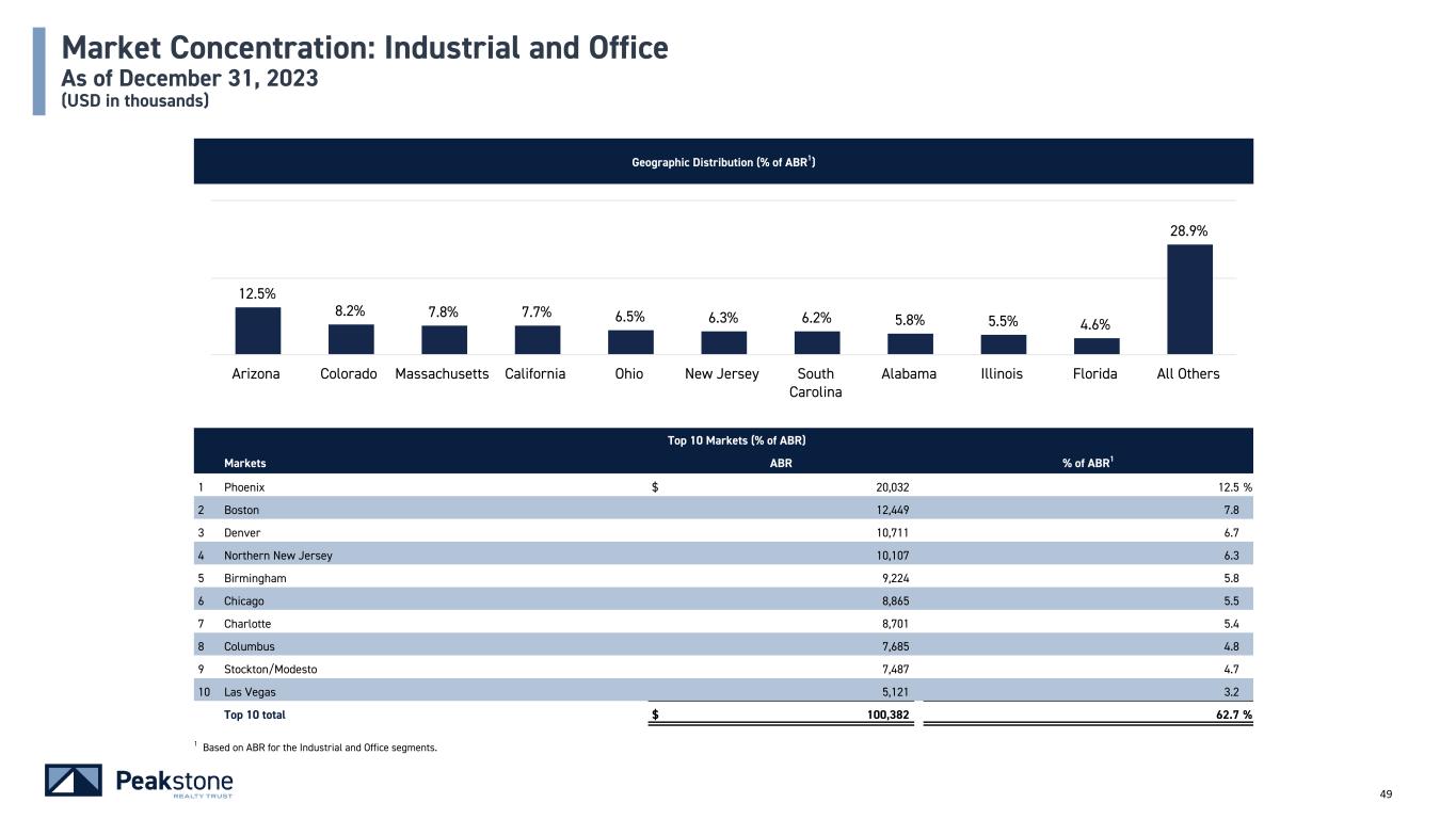 48 Geographic Distribution (% of ABR1) Market Concentration: Consolidated As of December 31, 2023 (USD in thousands) Top 10 Markets (% of ABR) Markets ABR % of ABR1 1 Phoenix $ 23,336 11.9 % 2 Northern New Jersey 19,532 9.9 3 Denver 14,100 7.2 4 Boston 12,449 6.3 5 Charlotte 12,266 6.2 6 Birmingham 9,224 4.7 7 Columbus 8,880 4.5 8 Chicago 8,865 4.5 9 Las Vegas 7,611 3.9 10 Stockton/Modesto 7,487 3.8 Top 10 total $ 123,750 62.9 % 11.9% 9.9% 8.4% 6.7% 6.3% 6.2% 5.2% 5.0% 4.6% 4.5% 31.3% Arizona New Jersey Colorado Ohio Massachusetts California Alabama South Carolina North Carolina Illinois All Others 1 Based on ABR for wholly-owned portfolio.