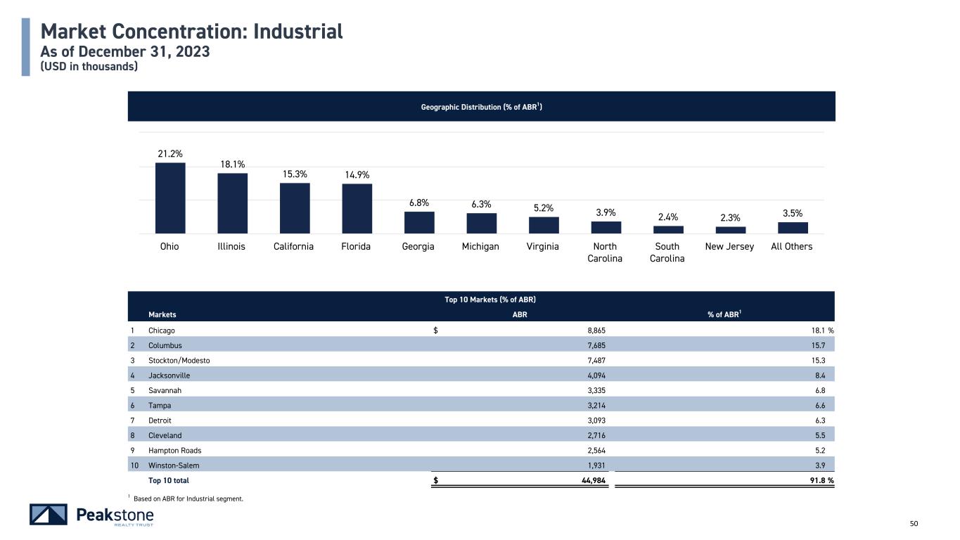 50 Geographic Distribution (% of ABR1) Market Concentration: Industrial As of December 31, 2023 (USD in thousands) Top 10 Markets (% of ABR) Markets ABR % of ABR1 1 Chicago $ 8,865 18.1 % 2 Columbus 7,685 15.7 3 Stockton/Modesto 7,487 15.3 4 Jacksonville 4,094 8.4 5 Savannah 3,335 6.8 6 Tampa 3,214 6.6 7 Detroit 3,093 6.3 8 Cleveland 2,716 5.5 9 Hampton Roads 2,564 5.2 10 Winston-Salem 1,931 3.9 Top 10 total $ 44,984 91.8 % 21.2% 18.1% 15.3% 14.9% 6.8% 6.3% 5.2% 3.9% 2.4% 2.3% 3.5% Ohio Illinois California Florida Georgia Michigan Virginia North Carolina South Carolina New Jersey All Others 1 Based on ABR for Industrial segment.