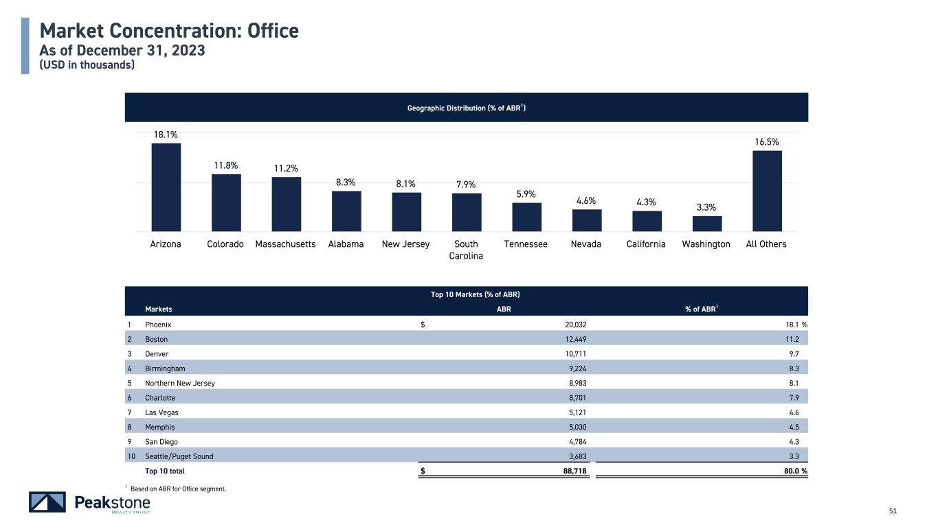 49 Geographic Distribution (% of ABR1) Market Concentration: Industrial and Office As of December 31, 2023 (USD in thousands) Top 10 Markets (% of ABR) Markets ABR % of ABR1 1 Phoenix $ 20,032 12.5 % 2 Boston 12,449 7.8 3 Denver 10,711 6.7 4 Northern New Jersey 10,107 6.3 5 Birmingham 9,224 5.8 6 Chicago 8,865 5.5 7 Charlotte 8,701 5.4 8 Columbus 7,685 4.8 9 Stockton/Modesto 7,487 4.7 10 Las Vegas 5,121 3.2 Top 10 total $ 100,382 62.7 % 12.5% 8.2% 7.8% 7.7% 6.5% 6.3% 6.2% 5.8% 5.5% 4.6% 28.9% Arizona Colorado Massachusetts California Ohio New Jersey South Carolina Alabama Illinois Florida All Others 1 Based on ABR for the Industrial and Office segments.