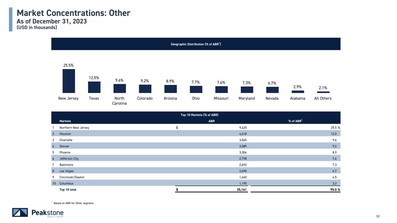 51 Geographic Distribution (% of ABR1) Market Concentration: Office As of December 31, 2023 (USD in thousands) Top 10 Markets (% of ABR) Markets ABR % of ABR1 1 Phoenix $ 20,032 18.1 % 2 Boston 12,449 11.2 3 Denver 10,711 9.7 4 Birmingham 9,224 8.3 5 Northern New Jersey 8,983 8.1 6 Charlotte 8,701 7.9 7 Las Vegas 5,121 4.6 8 Memphis 5,030 4.5 9 San Diego 4,784 4.3 10 Seattle/Puget Sound 3,683 3.3 Top 10 total $ 88,718 80.0 % 18.1% 11.8% 11.2% 8.3% 8.1% 7.9% 5.9% 4.6% 4.3% 3.3% 16.5% Arizona Colorado Massachusetts Alabama New Jersey South Carolina Tennessee Nevada California Washington All Others 1 Based on ABR for Office segment.