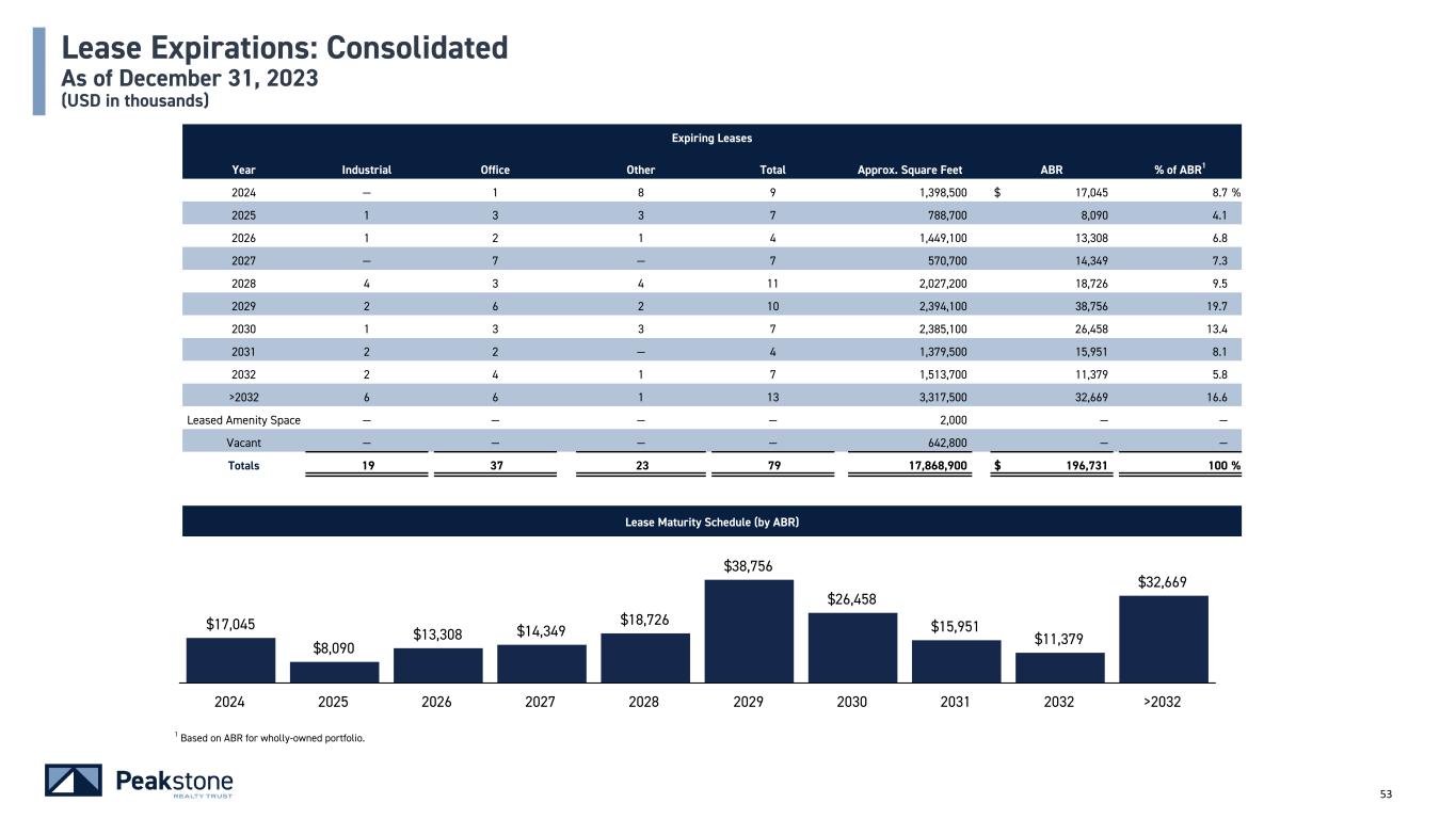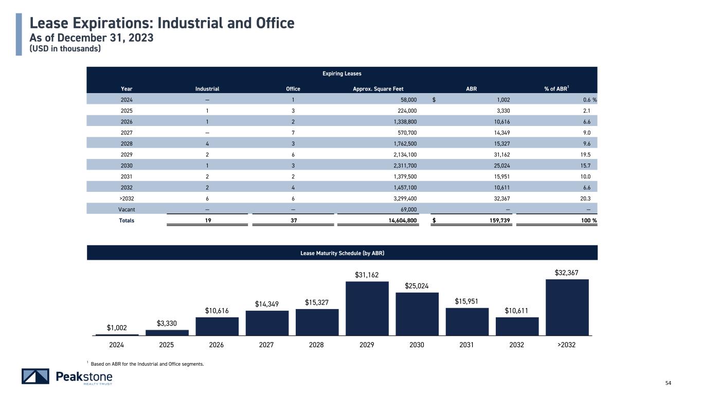53 Lease Expirations: Consolidated As of December 31, 2023 (USD in thousands) Lease Maturity Schedule (by ABR) 1 Based on ABR for wholly-owned portfolio. $17,045 $8,090 $13,308 $14,349 $18,726 $38,756 $26,458 $15,951 $11,379 $32,669 2024 2025 2026 2027 2028 2029 2030 2031 2032 >2032 Expiring Leases Year Industrial Office Other Total Approx. Square Feet ABR % of ABR1 2024 — 1 8 9 1,398,500 $ 17,045 8.7 % 2025 1 3 3 7 788,700 8,090 4.1 2026 1 2 1 4 1,449,100 13,308 6.8 2027 — 7 — 7 570,700 14,349 7.3 2028 4 3 4 11 2,027,200 18,726 9.5 2029 2 6 2 10 2,394,100 38,756 19.7 2030 1 3 3 7 2,385,100 26,458 13.4 2031 2 2 — 4 1,379,500 15,951 8.1 2032 2 4 1 7 1,513,700 11,379 5.8 >2032 6 6 1 13 3,317,500 32,669 16.6 Leased Amenity Space — — — — 2,000 — — Vacant — — — — 642,800 — — Totals 19 37 23 79 17,868,900 $ 196,731 100 %
