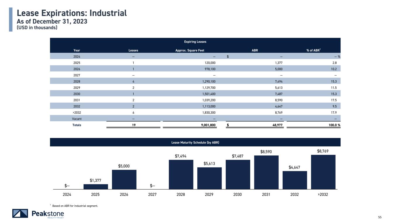 54 Lease Expirations: Industrial and Office As of December 31, 2023 (USD in thousands) Lease Maturity Schedule (by ABR) $1,002 $3,330 $10,616 $14,349 $15,327 $31,162 $25,024 $15,951 $10,611 $32,367 2024 2025 2026 2027 2028 2029 2030 2031 2032 >2032 Expiring Leases Year Industrial Office Approx. Square Feet ABR % of ABR1 2024 — 1 58,000 $ 1,002 0.6 % 2025 1 3 224,000 3,330 2.1 2026 1 2 1,338,800 10,616 6.6 2027 — 7 570,700 14,349 9.0 2028 4 3 1,762,500 15,327 9.6 2029 2 6 2,134,100 31,162 19.5 2030 1 3 2,311,700 25,024 15.7 2031 2 2 1,379,500 15,951 10.0 2032 2 4 1,457,100 10,611 6.6 >2032 6 6 3,299,400 32,367 20.3 Vacant — — 69,000 — — Totals 19 37 14,604,800 $ 159,739 100 % 1 Based on ABR for the Industrial and Office segments.