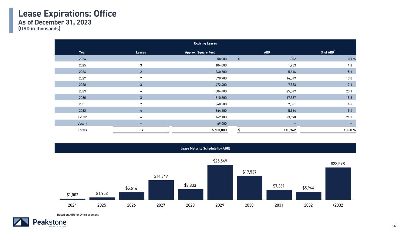 55 Lease Expirations: Industrial As of December 31, 2023 (USD in thousands) Lease Maturity Schedule (by ABR) $— $1,377 $5,000 $— $7,494 $5,613 $7,487 $8,590 $4,647 $8,769 2024 2025 2026 2027 2028 2029 2030 2031 2032 >2032 Expiring Leases Year Leases Approx. Square Feet ABR % of ABR1 2024 — — $ — — % 2025 1 120,000 1,377 2.8 2026 1 978,100 5,000 10.2 2027 — — — — 2028 4 1,290,100 7,494 15.3 2029 2 1,129,700 5,613 11.5 2030 1 1,501,400 7,487 15.3 2031 2 1,039,200 8,590 17.5 2032 2 1,113,000 4,647 9.5 >2032 6 1,830,300 8,769 17.9 Vacant — — — — Totals 19 9,001,800 $ 48,977 100.0 % 1 Based on ABR for Industrial segment.