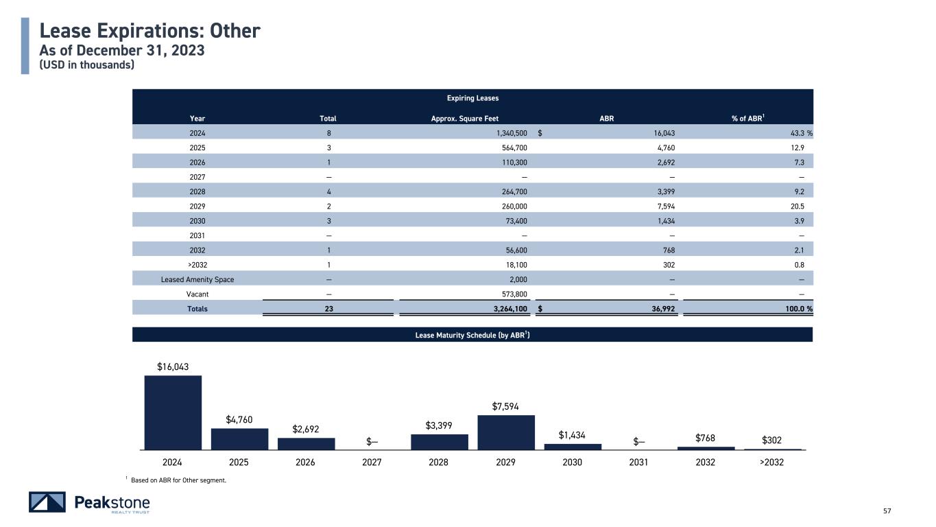 56 Lease Expirations: Office As of December 31, 2023 (USD in thousands) Lease Maturity Schedule (by ABR) $1,002 $1,953 $5,616 $14,349 $7,833 $25,549 $17,537 $7,361 $5,964 $23,598 2024 2025 2026 2027 2028 2029 2030 2031 2032 >2032 Expiring Leases Year Leases Approx. Square Feet ABR % of ABR1 2024 1 58,000 $ 1,002 0.9 % 2025 3 104,000 1,953 1.8 2026 2 360,700 5,616 5.1 2027 7 570,700 14,349 13.0 2028 3 472,400 7,833 7.1 2029 6 1,004,400 25,549 23.1 2030 3 810,300 17,537 15.8 2031 2 340,300 7,361 6.6 2032 4 344,100 5,964 5.4 >2032 6 1,469,100 23,598 21.3 Vacant — 69,000 — — Totals 37 5,603,000 $ 110,762 100.0 % 1 Based on ABR for Office segment.