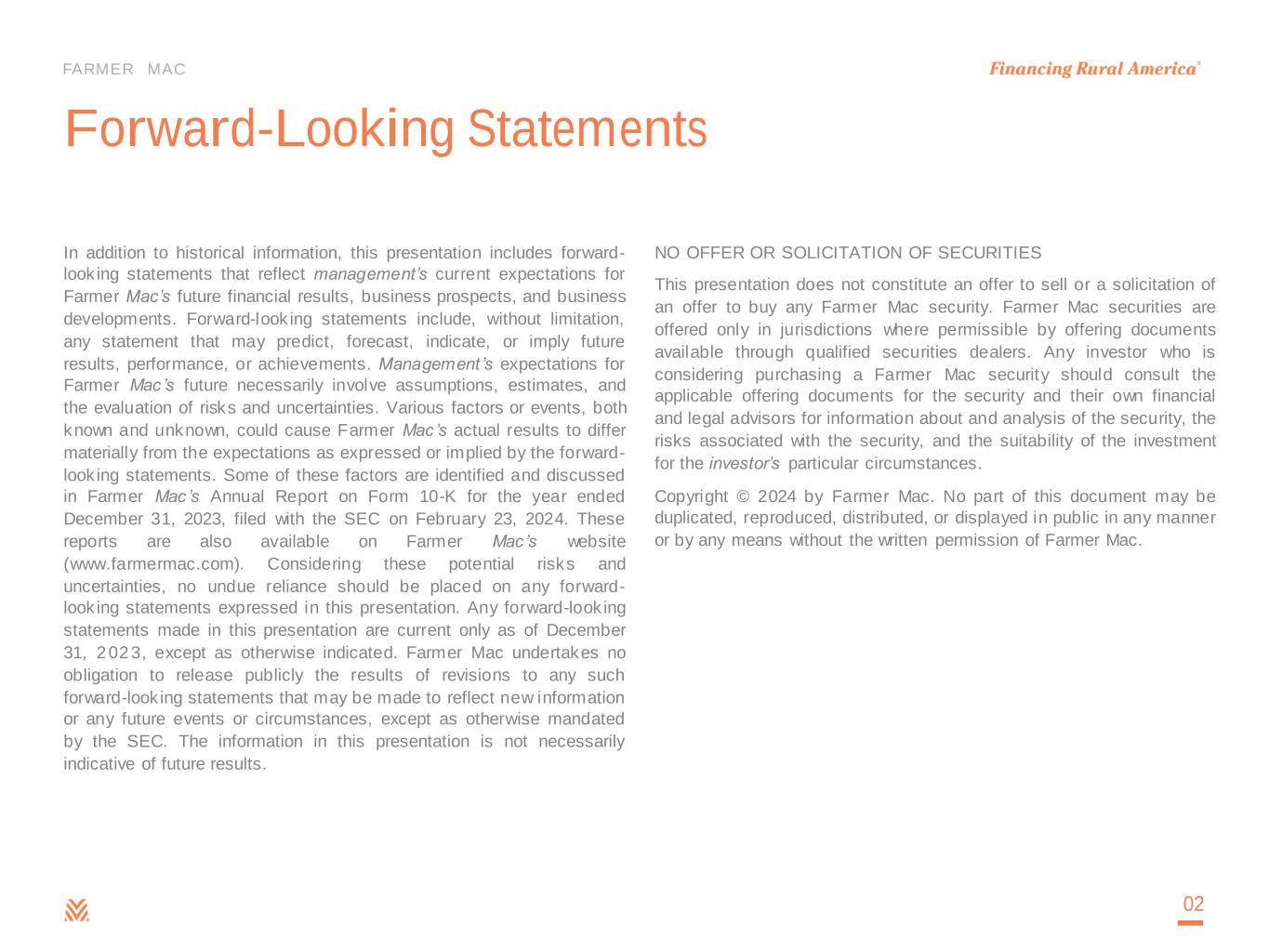 FARMER MAC Forward-Looking Statements In addition to historical information, this presentation includes forward- look ing statements that reflect management’s current expectations for Farmer Mac’s future financial results, business prospects, and business developments. Forward-look ing statements include, without limitation, any statement that may predict, forecast, indicate, or imply future results, performance, or achievements. Management ’s expectations for Farmer Mac’s future necessarily involve assumptions, estimates, and the evaluation of risks and uncertainties. Various factors or events, both known and unknown, could cause Farmer Mac’s actual results to differ materially from the expectations as expressed or implied by the forward- look ing statements. Some of these factors are identified and discussed in Farmer Mac’s Annual Report on Form 10-K for the year ended December 31, 2023, filed with the SEC on February 23, 2024. These reports are also available on Farmer Mac’s website (www.farmermac.com). Considering these potential risks and uncertainties, no undue reliance should be placed on any forward- look ing statements expressed in this presentation. Any forward-look ing statements made in this presentation are current only as of December 31, 2023, except as otherwise indicated. Farmer Mac undertakes no obligation to release publicly the results of revisions to any such forward-look ing statements that may be made to reflect new information or any future events or circumstances, except as otherwise mandated by the SEC. The information in this presentation is not necessarily indicative of future results. NO OFFER OR SOLICITATION OF SECURITIES This presentation does not constitute an offer to sell or a solicitation of an offer to buy any Farmer Mac security. Farmer Mac securities are offered only in jurisdictions where permissible by offering documents available through qualified securities dealers. Any investor who is considering purchasing a Farmer Mac security should consult the applicable offering documents for the security and their own financial and legal advisors for information about and analysis of the security, the risks associated with the security, and the suitability of the investment for the investor’s particular circumstances. Copyright © 2024 by Farmer Mac. No part of this document may be duplicated, reproduced, distributed, or displayed in public in any manner or by any means without the written permission of Farmer Mac. 02