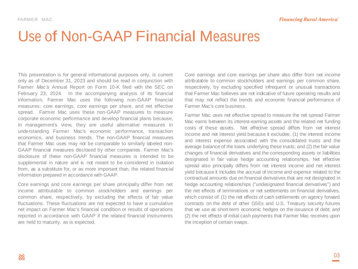 FARMER MAC Use of Non-GAAP Financial Measures This presentation is for general informational purposes only, is current only as of December 31, 2023 and should be read in conjunction with Farmer Mac’s Annual Report on Form 10-K filed with the SEC on February 23, 2024. In the accompanying analysis of its financial information, Farmer Mac uses the following non-GAAP financial measures: core earnings, core earnings per share, and net effective spread. Farmer Mac uses these non-GAAP measures to measure corporate economic performance and develop financial plans because, in management's view, they are useful alternative measures in understanding Farmer Mac's economic performance, transaction economics, and business trends. The non-GAAP financial measures that Farmer Mac uses may not be comparable to similarly labeled non- GAAP financial measures disclosed by other companies. Farmer Mac's disclosure of these non-GAAP financial measures is intended to be supplemental in nature and is not meant to be considered in isolation from, as a substitute for, or as more important than, the related financial information prepared in accordance with GAAP. Core earnings and core earnings per share principally differ from net income attributable to common stockholders and earnings per common share, respectively, by excluding the effects of fair value fluctuations. These fluctuations are not expected to have a cumulative net impact on Farmer Mac's financial condition or results of operations reported in accordance with GAAP if the related financial instruments are held to maturity, as is expected. Core earnings and core earnings per share also differ from net income attributable to common stockholders and earnings per common share, respectively, by excluding specified infrequent or unusual transactions that Farmer Mac believes are not indicative of future operating results and that may not reflect the trends and economic financial performance of Farmer Mac's core business. Farmer Mac uses net effective spread to measure the net spread Farmer Mac earns between its interest-earning assets and the related net funding costs of these assets. Net effective spread differs from net interest income and net interest yield because it excludes: (1) the interest income and interest expense associated with the consolidated trusts and the average balance of the loans underlying these trusts; and (2) the fair value changes of financial derivatives and the corresponding assets or liabilities designated in fair value hedge accounting relationships. Net effective spread also principally differs from net interest income and net interest yield because it includes the accrual of income and expense related to the contractual amounts due on financial derivatives that are not designated in hedge accounting relationships ("undesignated financial derivatives") and the net effects of terminations or net settlements on financial derivatives, which consist of: (1) the net effects of cash settlements on agency forward contracts on the debt of other GSEs and U.S. Treasury security futures that we use as short-term economic hedges on the issuance of debt; and (2) the net effects of initial cash payments that Farmer Mac receives upon the inception of certain swaps. 03