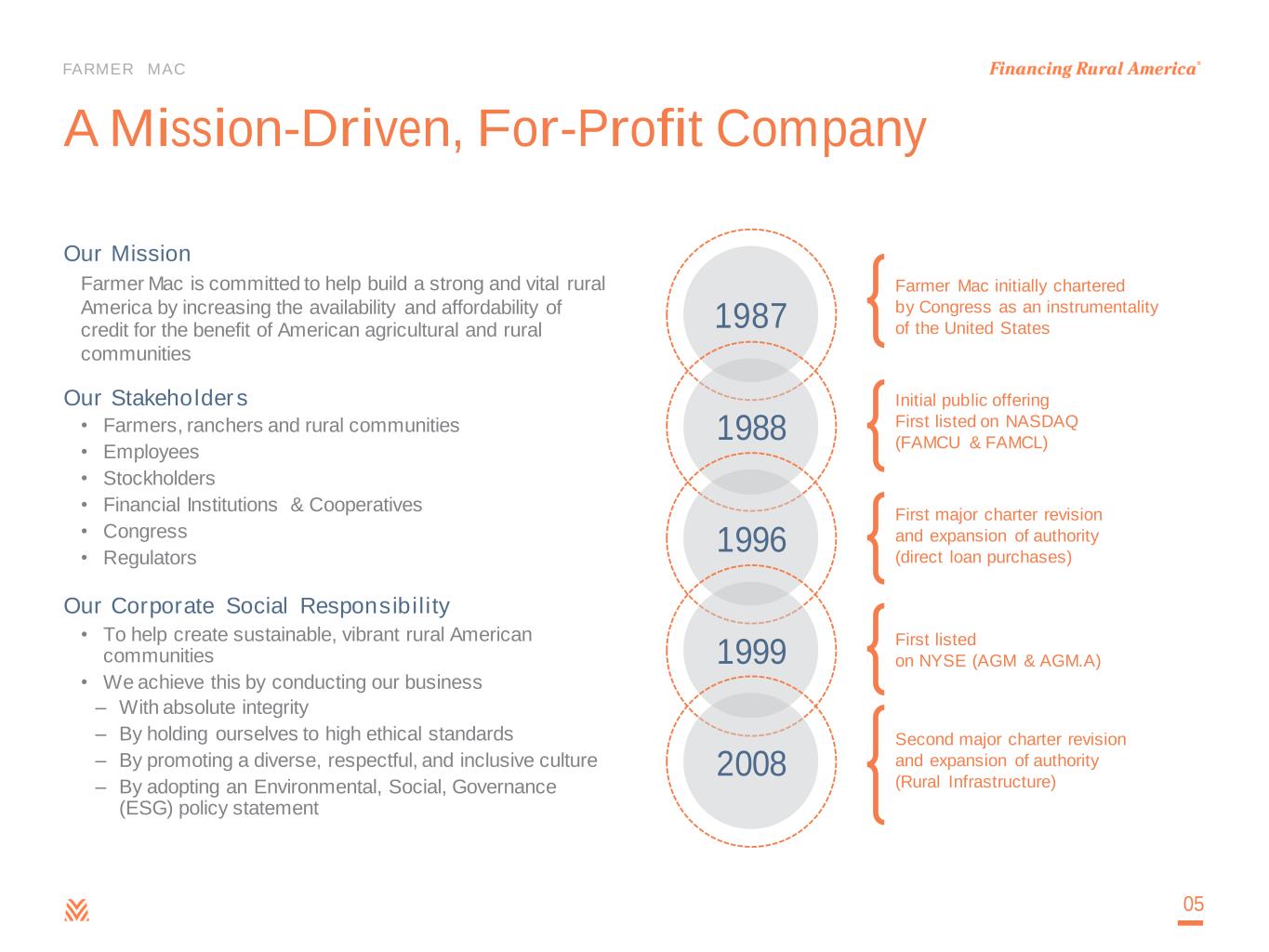 FARMER MAC Farmer Mac initially chartered by Congress as an instrumentality of the United States Initial public offering First listed on NASDAQ (FAMCU & FAMCL) First major charter revision and expansion of authority (direct loan purchases) First listed on NYSE (AGM & AGM.A) Second major charter revision and expansion of authority (Rural Infrastructure) A Mission-Driven, For-Profit Company Our Mission Farmer Mac is committed to help build a strong and vital rural America by increasing the availability and affordability of credit for the benefit of American agricultural and rural communities Our Stakeholders • Farmers, ranchers and rural communities • Employees • Stockholders • Financial Institutions & Cooperatives • Congress • Regulators Our Corporate Social Responsibility • To help create sustainable, vibrant rural American communities • We achieve this by conducting our business – With absolute integrity – By holding ourselves to high ethical standards – By promoting a diverse, respectful, and inclusive culture – By adopting an Environmental, Social, Governance (ESG) policy statement 05 1987 1988 1996 1999 2008
