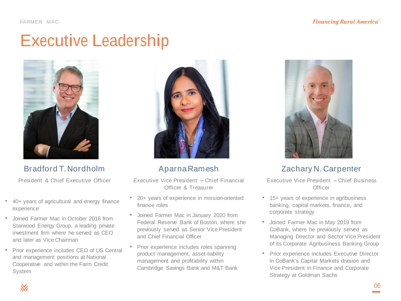 FARMER MAC Aparna Ramesh Executive Vice President – Chief Financial Officer & Treasurer • 20+ years of experience in mission-oriented finance roles • Joined Farmer Mac in January 2020 from Federal Reserve Bank of Boston, where she previously served as Senior Vice President and Chief Financial Officer • Prior experience includes roles spanning product management, asset-liability management and profitability within Cambridge Savings Bank and M&T Bank Bradford T. Nordholm President & Chief Executive Officer • 40+ years of agricultural and energy finance experience • Joined Farmer Mac in October 2018 from Starwood Energy Group, a leading private investment firm where he served as CEO and later as Vice Chairman • Prior experience includes CEO of US Central and management positions at National Cooperative and within the Farm Credit System Executive Leadership 06 Zachary N. Carpenter Executive Vice President – Chief Business Officer • 15+ years of experience in agribusiness banking, capital markets, finance, and corporate strategy • Joined Farmer Mac in May 2019 from CoBank, where he previously served as Managing Director and Sector Vice President of its Corporate Agribusiness Banking Group • Prior experience includes Executive Director in CoBank’s Capital Markets division and Vice President in Finance and Corporate Strategy at Goldman Sachs