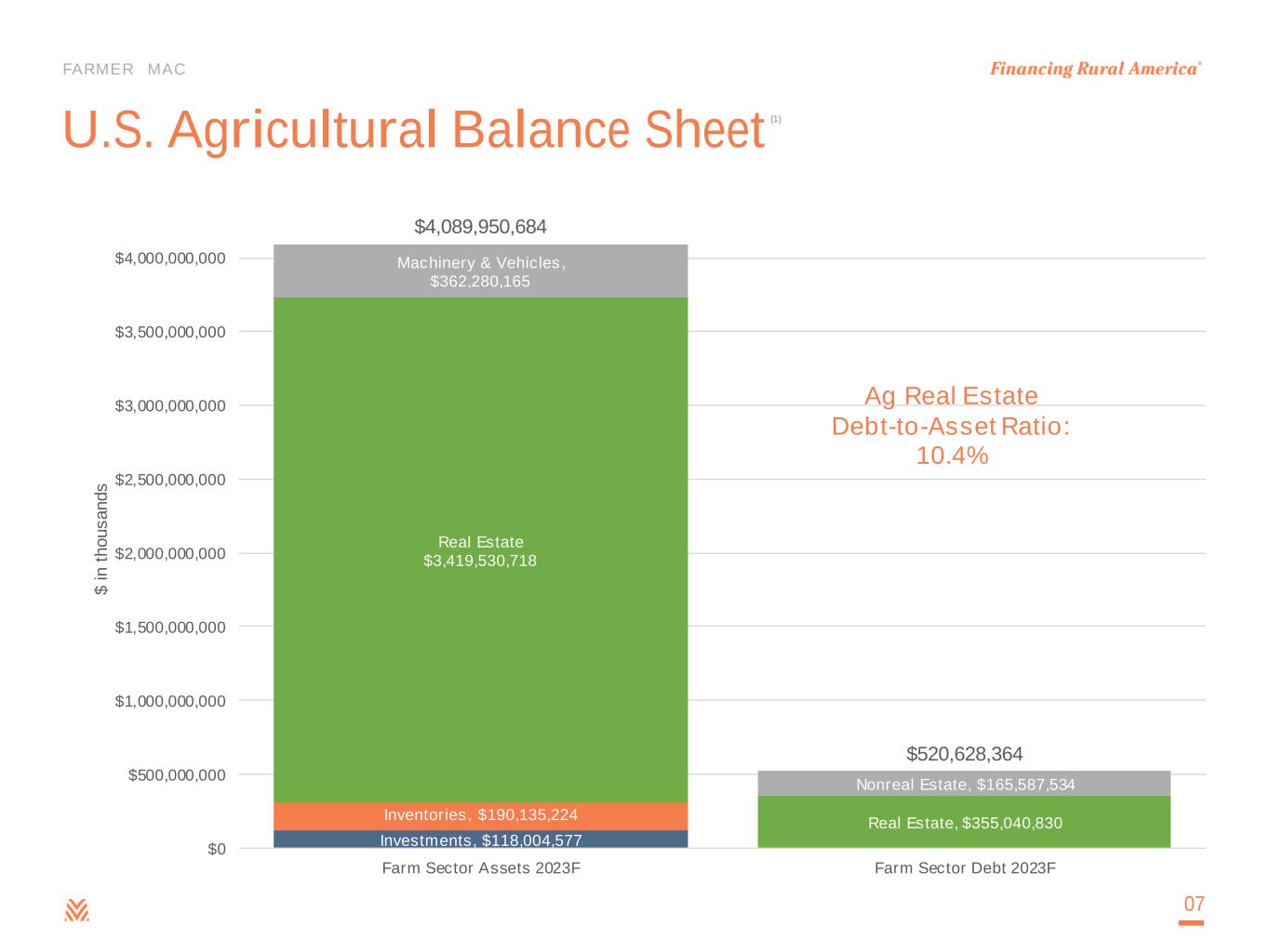 FARMER MAC U.S. Agricultural Balance Sheet 07 Investments, $118,004,577 Inventories, $190,135,224 Real Estate $3,419,530,718 Machinery & Vehicles, $362,280,165 $4,089,950,684 Real Estate, $355,040,830 Nonreal Estate, $165,587,534 $520,628,364 $0 $500,000,000 $1,000,000,000 $1,500,000,000 $2,000,000,000 $2,500,000,000 $3,000,000,000 $3,500,000,000 $4,000,000,000 Farm Sector Assets 2023F Farm Sector Debt 2023F $ i n t h o u s a n d s Ag Real Estate Debt-to-Asset Ratio: 10.4% (1)