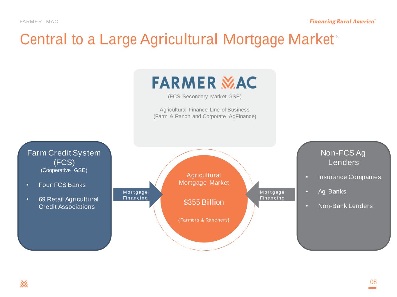 FARMER MAC (FCS Secondary Market GSE) Agricultural Finance Line of Business (Farm & Ranch and Corporate AgFinance) Farm Credit System (FCS) (Cooperative GSE) • Four FCS Banks • 69 Retail Agricultural Credit Associations Central to a Large Agricultural Mortgage Market 08 Agricultural Mortgage Market {Farmers & Ranchers} M or tgage Financing M or tgage Financing $355 Billion A G B A N K S $ 6 1 B N O N -B A N K L E N D E R S $ 1 3 B (2) Non-FCS Ag Lenders • Insurance Companies • Ag Banks • Non-Bank Lenders