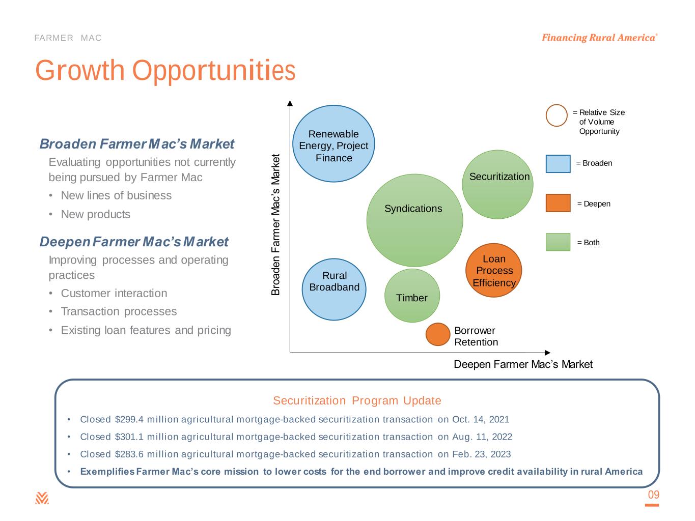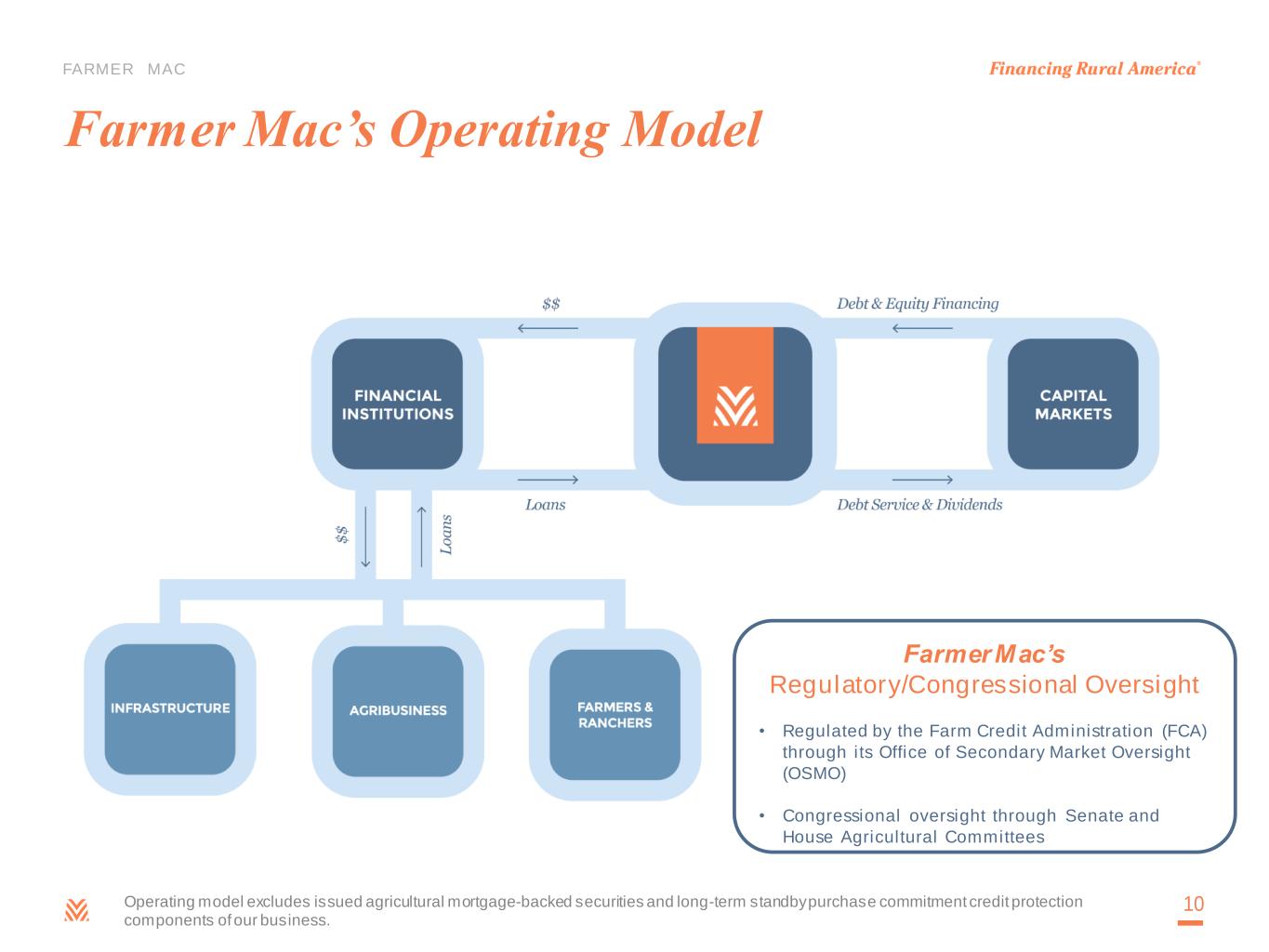 FARMER MAC Securitization Program Update • Closed $299.4 million agricultural mortgage-backed securitization transaction on Oct. 14, 2021 • Closed $301.1 million agricultural mortgage-backed securitization transaction on Aug. 11, 2022 • Closed $283.6 million agricultural mortgage-backed securitization transaction on Feb. 23, 2023 • Exemplifies Farmer Mac’s core mission to lower costs for the end borrower and improve credit availability in rural America Growth Opportunities 09 Deepen Farmer Mac’s Market B ro a d e n F a rm e r M a c ’s M a rk e t Loan Process Efficiency Rural Broadband Borrower Retention Renewable Energy, Project Finance Timber Securitization = Relative Size of Volume Opportunity = Broaden = Deepen = Both Syndications Broaden Farmer Mac’s Market Evaluating opportunities not currently being pursued by Farmer Mac • New lines of business • New products Deepen Farmer Mac’s Market Improving processes and operating practices • Customer interaction • Transaction processes • Existing loan features and pricing
