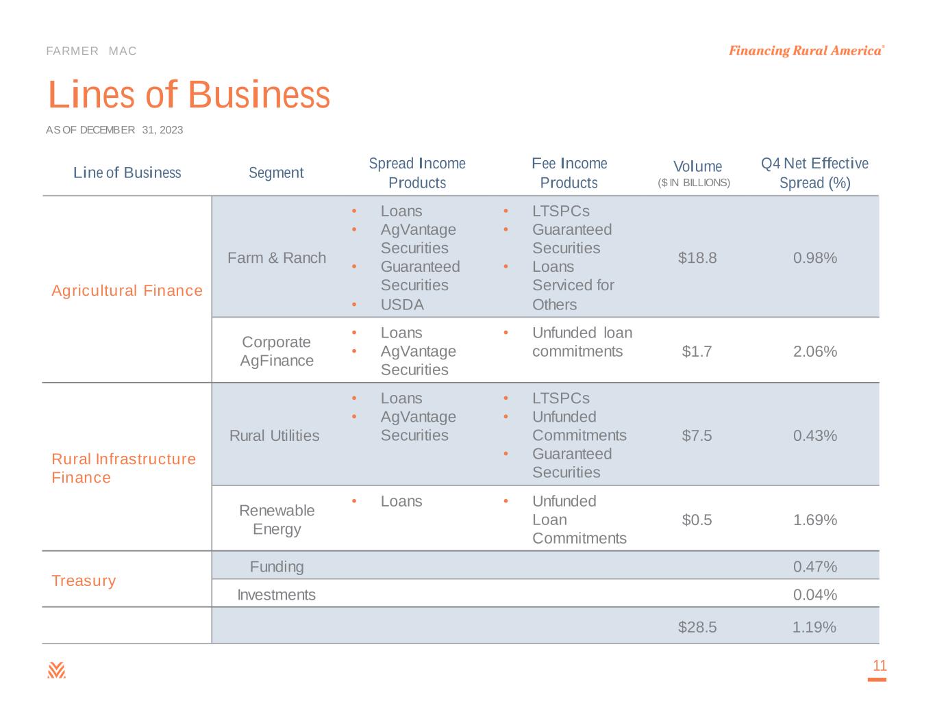 | Farm & Ranch | | Corporate AgFinance | | Rural Utilities | | Renewable Energy | | Funding | | Investments | | Net Effective Spread |