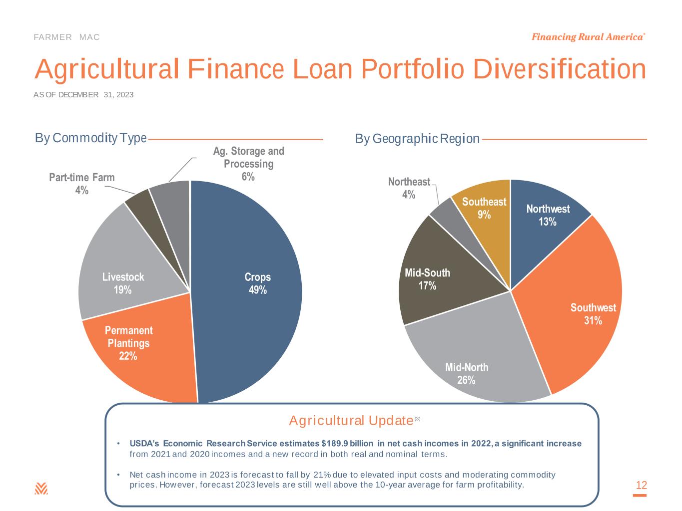 FARMER MAC Line of Business Segment Spread Income Products Fee Income Products Volume ($ IN BILLIONS) Q4 Net Effective Spread (%) Agricultural Finance Farm & Ranch • Loans • AgVantage Securities • Guaranteed Securities • USDA • LTSPCs • Guaranteed Securities • Loans Serviced for Others $18.8 0.98% Corporate AgFinance • Loans • AgVantage Securities • Unfunded loan commitments $1.7 2.06% Rural Infrastructure Finance Rural Utilities • Loans • AgVantage Securities • LTSPCs • Unfunded Commitments • Guaranteed Securities $7.5 0.43% Renewable Energy • Loans • Unfunded Loan Commitments $0.5 1.69% Treasury Funding 0.47% Investments 0.04% $28.5 1.19% Lines of Business 11 AS OF DECEMBER 31, 2023