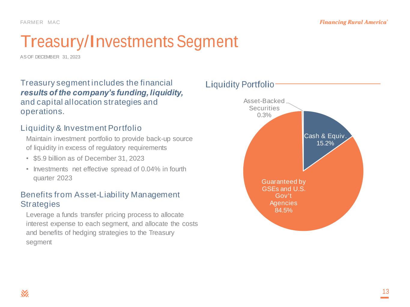 FARMER MAC Treasury/Investments Segment Treasury segment includes the financial results of the company’s funding, liquidity, and capital allocation strategies and operations. Liquidity & Investment Portfolio Maintain investment portfolio to provide back-up source of liquidity in excess of regulatory requirements • $5.9 billion as of December 31, 2023 • Investments net effective spread of 0.04% in fourth quarter 2023 Benefits from Asset-Liability Management Strategies Leverage a funds transfer pricing process to allocate interest expense to each segment, and allocate the costs and benefits of hedging strategies to the Treasury segment 13 AS OF DECEMBER 31, 2023 Liquidity Portfolio Cash & Equiv. 15.2% Guaranteed by GSEs and U.S. Gov't Agencies 84.5% Asset-Backed Securities 0.3%