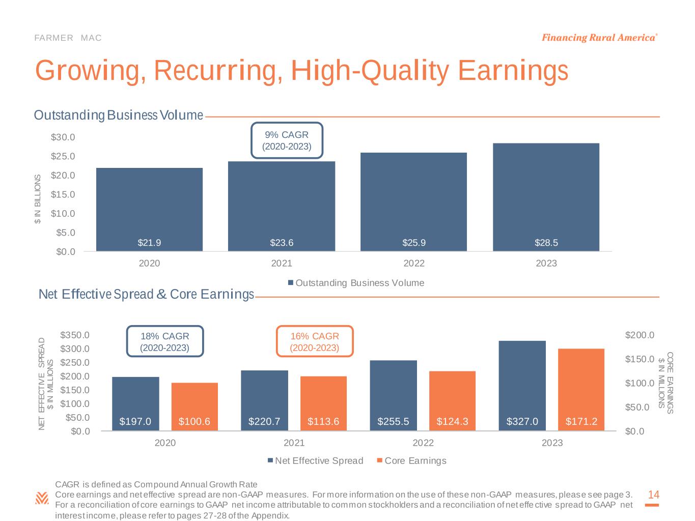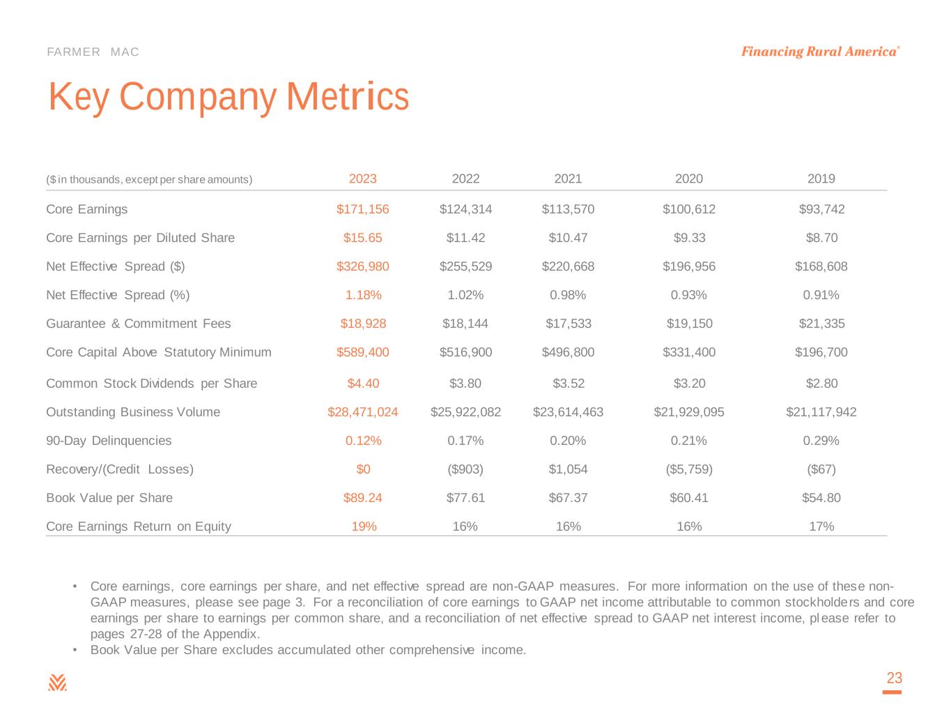 More information about Farmer Mac’s use of non-GAAP measures is available in "Management's Discussion and Analysis of Financial Condition and Results of Operations—Results of Operations" in Farmer Mac's Annual Report on Form 10-K for the year ended December 31, 2023, filed today with the SEC. For a reconciliation of Farmer Mac's net income attributable to common stockholders to core earnings and of earnings per common share to core earnings per share, and net interest income and net interest yield to net effective spread, see "Reconciliations" below.