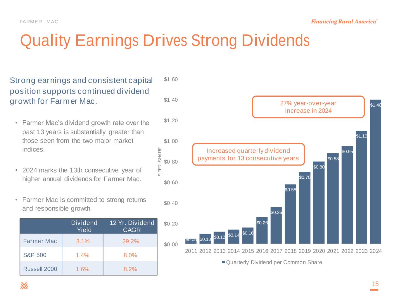 FARMER MAC $197.0 $220.7 $255.5 $327.0$100.6 $113.6 $124.3 $171.2 $0.0 $50.0 $100.0 $150.0 $200.0 $0.0 $50.0 $100.0 $150.0 $200.0 $250.0 $300.0 $350.0 2020 2021 2022 2023 C O R E E A R N IN G S $ IN M IL L IO N S N E T E F F E C T IV E S P R E A D $ IN M IL L IO N S Net Effective Spread & Core Earnings Net Effective Spread Core Earnings Growing, Recurring, High-Quality Earnings $21.9 $23.6 $25.9 $28.5 $0.0 $5.0 $10.0 $15.0 $20.0 $25.0 $30.0 2020 2021 2022 2023 $ IN B IL L IO N S Outstanding Business Volume Outstanding Business Volume 14 9% CAGR (2020-2023) 18% CAGR (2020-2023) 16% CAGR (2020-2023) CAGR is defined as Compound Annual Growth Rate Core earnings and net effective spread are non-GAAP measures. For more information on the use of these non-GAAP measures, please see page 3. For a reconciliation of core earnings to GAAP net income attributable to common stockholders and a reconciliation of net effe ctive spread to GAAP net interest income, please refer to pages 27-28 of the Appendix.
