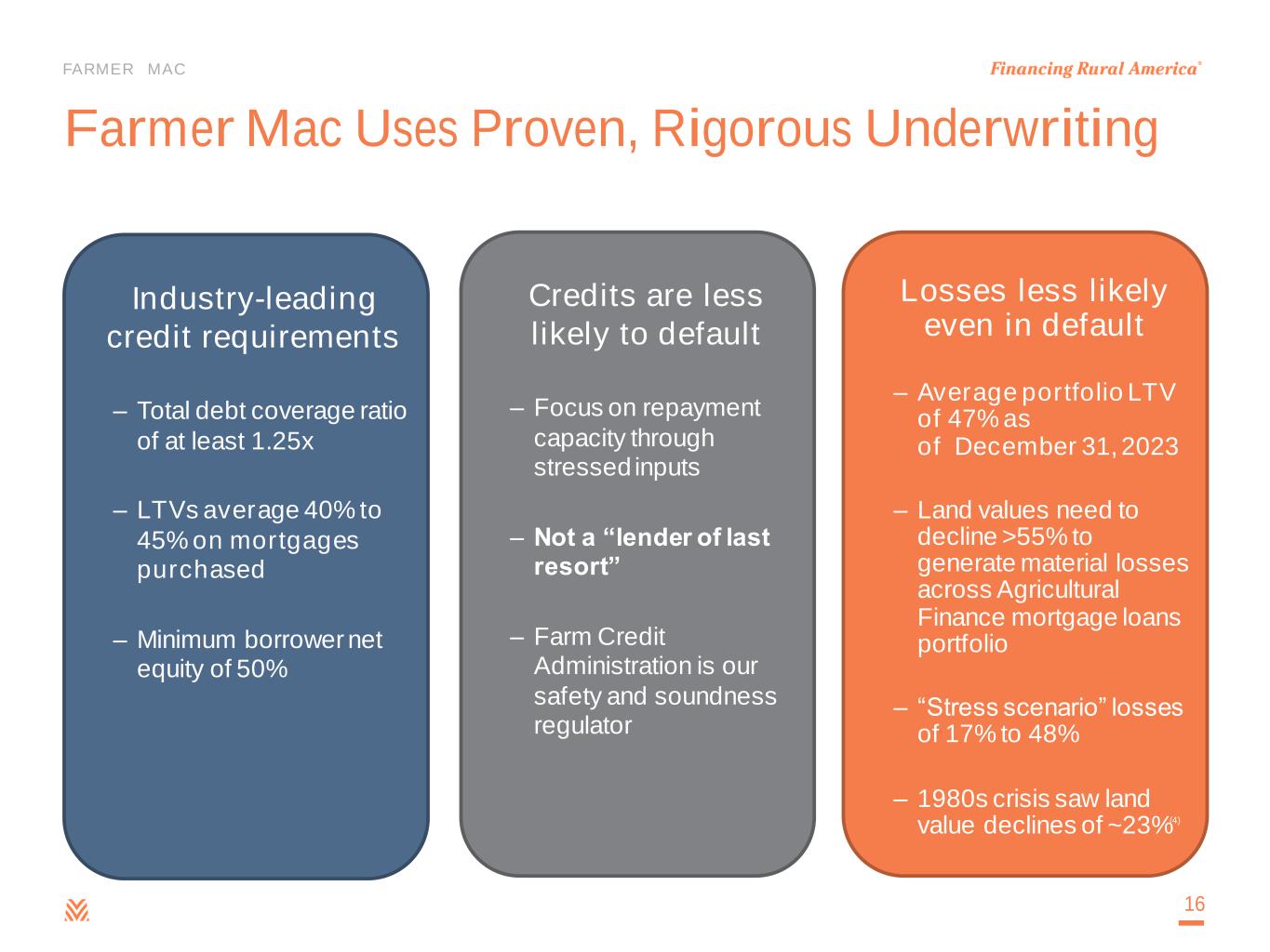 FARMER MAC Quality Earnings Drives Strong Dividends $0.05 $0.10 $0.12 $0.14 $0.16 $0.26 $0.36 $0.58 $0.70 $0.80 $0.88 $0.95 $1.10 $1.40 $0.00 $0.20 $0.40 $0.60 $0.80 $1.00 $1.20 $1.40 $1.60 2011 2012 2013 2014 2015 2016 2017 2018 2019 2020 2021 2022 2023 2024 $ P E R S H A R E Quarterly Dividend per Common Share 15 Increased quarterly dividend payments for 13 consecutive years Strong earnings and consistent capital position supports continued dividend growth for Farmer Mac. • Farmer Mac’s dividend growth rate over the past 13 years is substantially greater than those seen from the two major market indices. • 2024 marks the 13th consecutive year of higher annual dividends for Farmer Mac. • Farmer Mac is committed to strong returns and responsible growth. Dividend Yield 12 Yr. Dividend CAGR Farmer Mac 3.1% 29.2% S&P 500 1.4% 8.0% Russell 2000 1.6% 8.2% 27% year-over-year increase in 2024