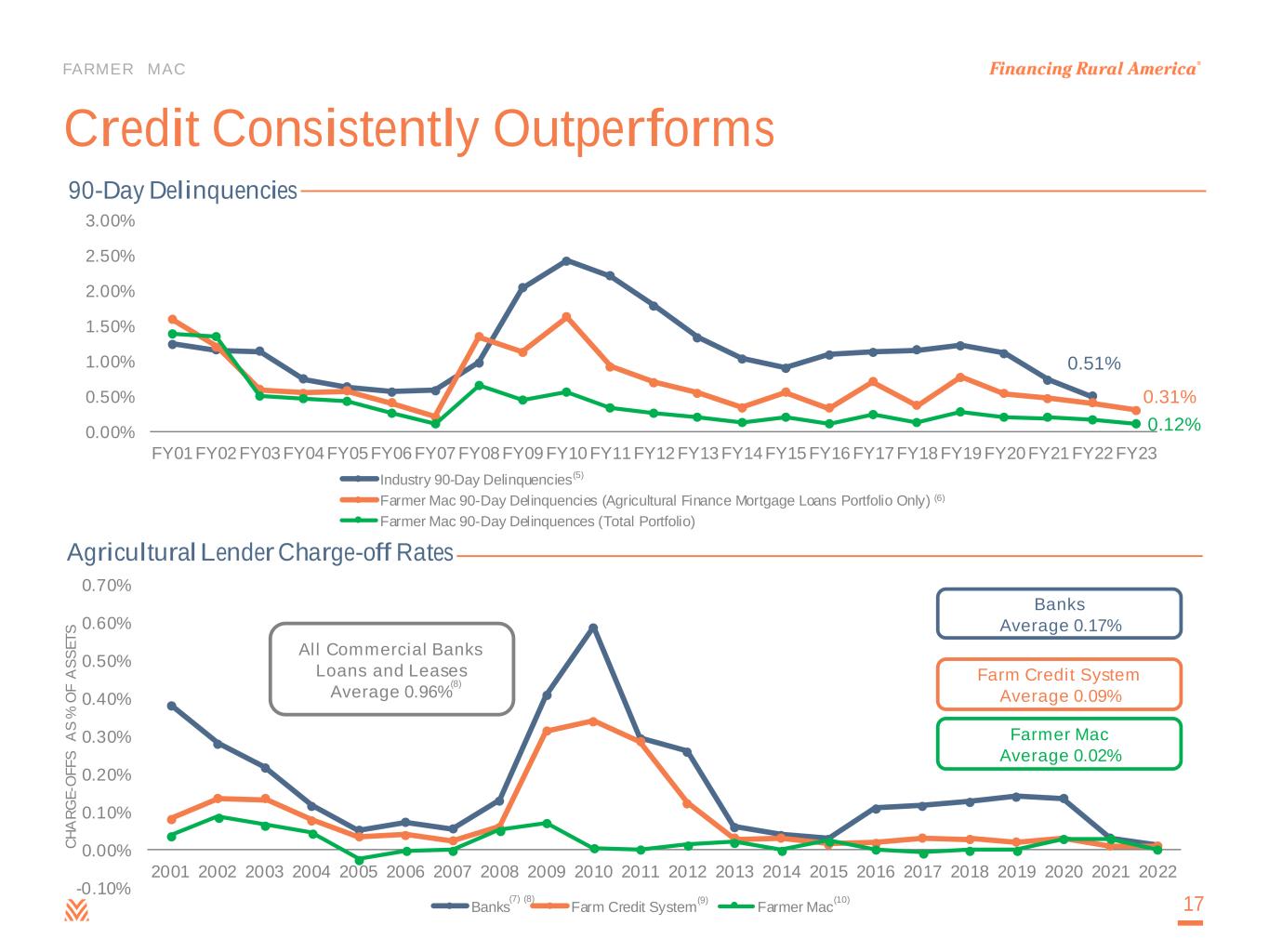 FARMER MAC Losses less likely even in default – Average portfolio LTV of 47% as of December 31, 2023 – Land values need to decline >55% to generate material losses across Agricultural Finance mortgage loans portfolio – “Stress scenario” losses of 17% to 48% – 1980s crisis saw land value declines of ~23% Farmer Mac Uses Proven, Rigorous Underwriting Industry-leading credit requirements – Total debt coverage ratio of at least 1.25x – LTVs average 40% to 45% on mortgages purchased – Minimum borrower net equity of 50% 16 Credits are less likely to default – Focus on repayment capacity through stressed inputs – Not a “lender of last resort” – Farm Credit Administration is our safety and soundness regulator (4)