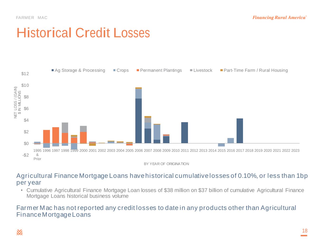 FARMER MAC Credit Consistently Outperforms 17 0.51% 0.31% 0.12%0.00% 0.50% 1.00% 1.50% 2.00% 2.50% 3.00% FY01 FY02 FY03 FY04 FY05 FY06 FY07 FY08 FY09 FY10 FY11 FY12 FY13 FY14 FY15 FY16 FY17 FY18 FY19 FY20 FY21 FY22 FY23 90-Day Delinquencies Industry 90-Day Delinquencies Farmer Mac 90-Day Delinquencies (Agricultural Finance Mortgage Loans Portfolio Only) Farmer Mac 90-Day Delinquences (Total Portfolio) -0.10% 0.00% 0.10% 0.20% 0.30% 0.40% 0.50% 0.60% 0.70% 2001 2002 2003 2004 2005 2006 2007 2008 2009 2010 2011 2012 2013 2014 2015 2016 2017 2018 2019 2020 2021 2022 C H A R G E -O F F S A S % O F A S S E T S Agricultural Lender Charge-off Rates Banks Farm Credit System Farmer Mac Farmer Mac Average 0.02% Farm Credit System Average 0.09% Banks Average 0.17% All Commercial Banks Loans and Leases Average 0.96% (8) (5) (6) (7) (8) (9) (10)