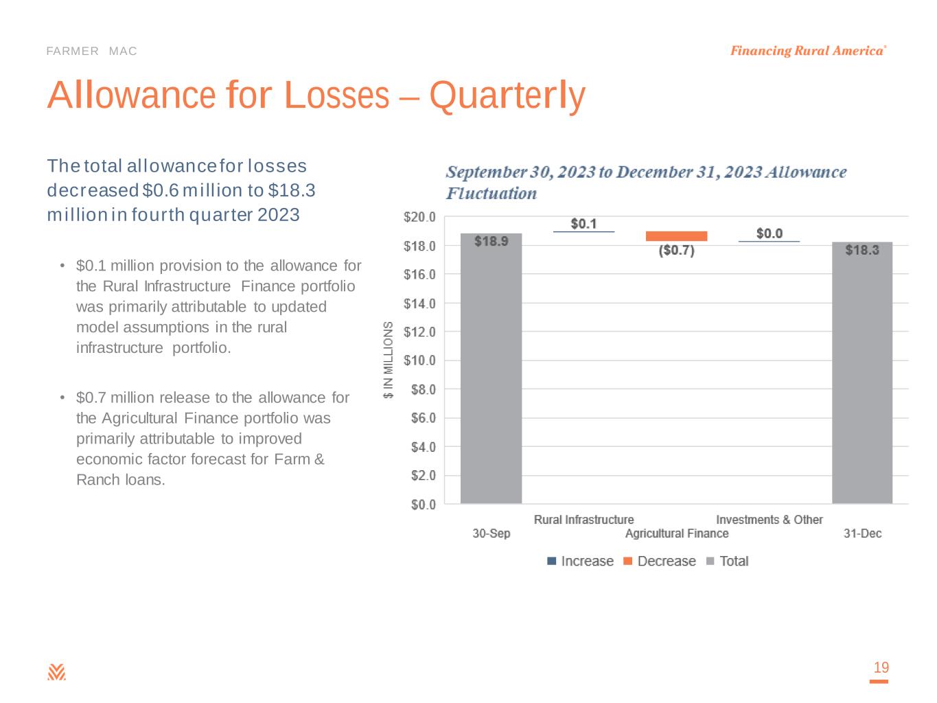 FARMER MAC Historical Credit Losses Agricultural Finance Mortgage Loans have historical cumulative losses of 0.10%, or less than 1bp per year • Cumulative Agricultural Finance Mortgage Loan losses of $38 million on $37 billion of cumulative Agricultural Finance Mortgage Loans historical business volume Farmer Mac has not reported any credit losses to date in any products other than Agricultural Finance Mortgage Loans 18 -$2 $0 $2 $4 $6 $8 $10 $12 1995 & Prior 1996 1997 1998 1999 2000 2001 2002 2003 2004 2005 2006 2007 2008 2009 2010 2011 2012 2013 2014 2015 2016 2017 2018 2019 2020 2021 2022 2023 N E T L O S S / ( G A IN ) $ IN M IL L IO N S BY YEAR OF ORIGINATION Ag Storage & Processing Crops Permanent Plantings Livestock Part-Time Farm / Rural Housing