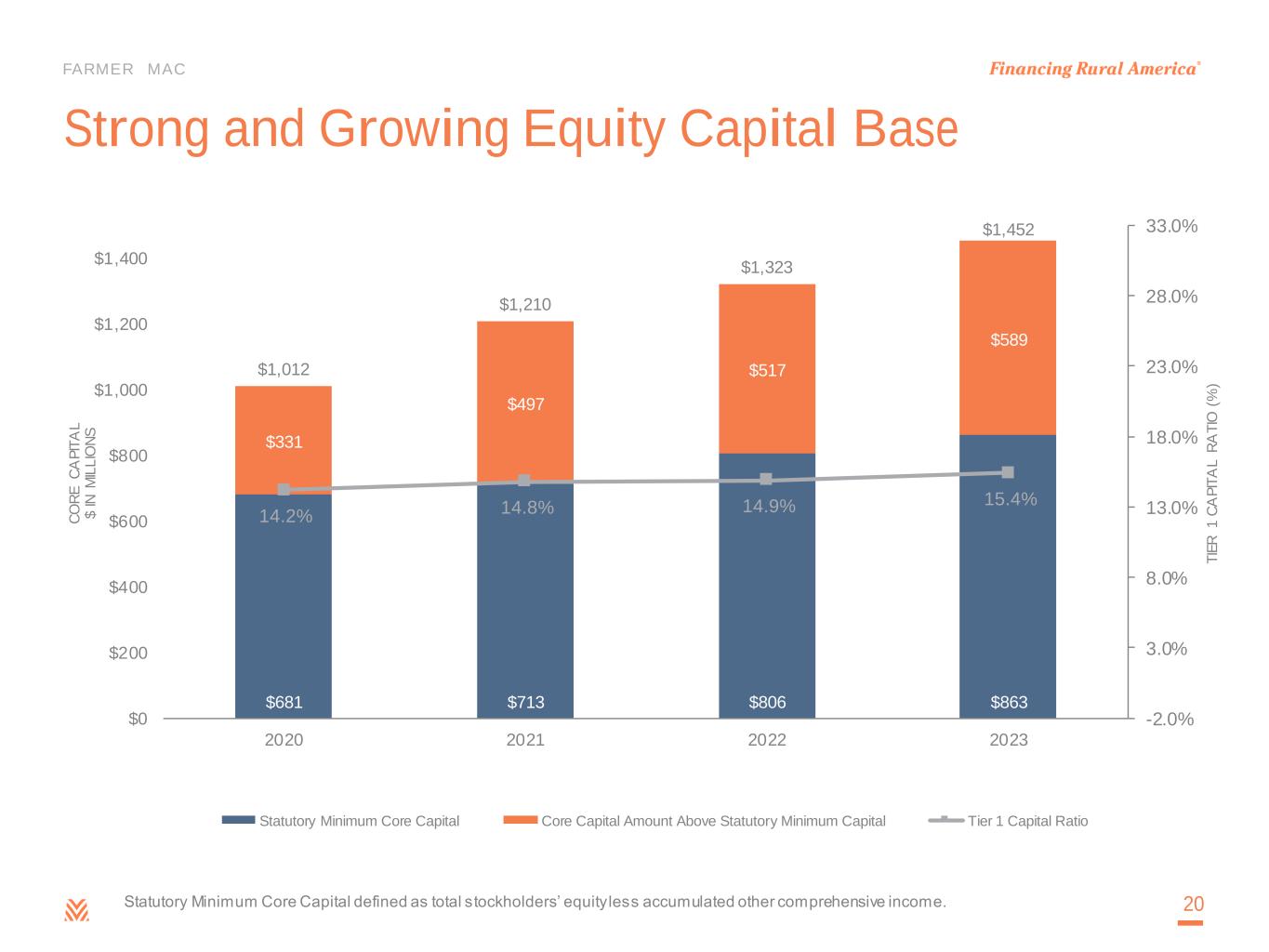 FARMER MAC Allowance for Losses – Quarterly 19 The total allowance for losses decreased $0.6 million to $18.3 million in fourth quarter 2023 • $0.1 million provision to the allowance for the Rural Infrastructure Finance portfolio was primarily attributable to updated model assumptions in the rural infrastructure portfolio. • $0.7 million release to the allowance for the Agricultural Finance portfolio was primarily attributable to improved economic factor forecast for Farm & Ranch loans.