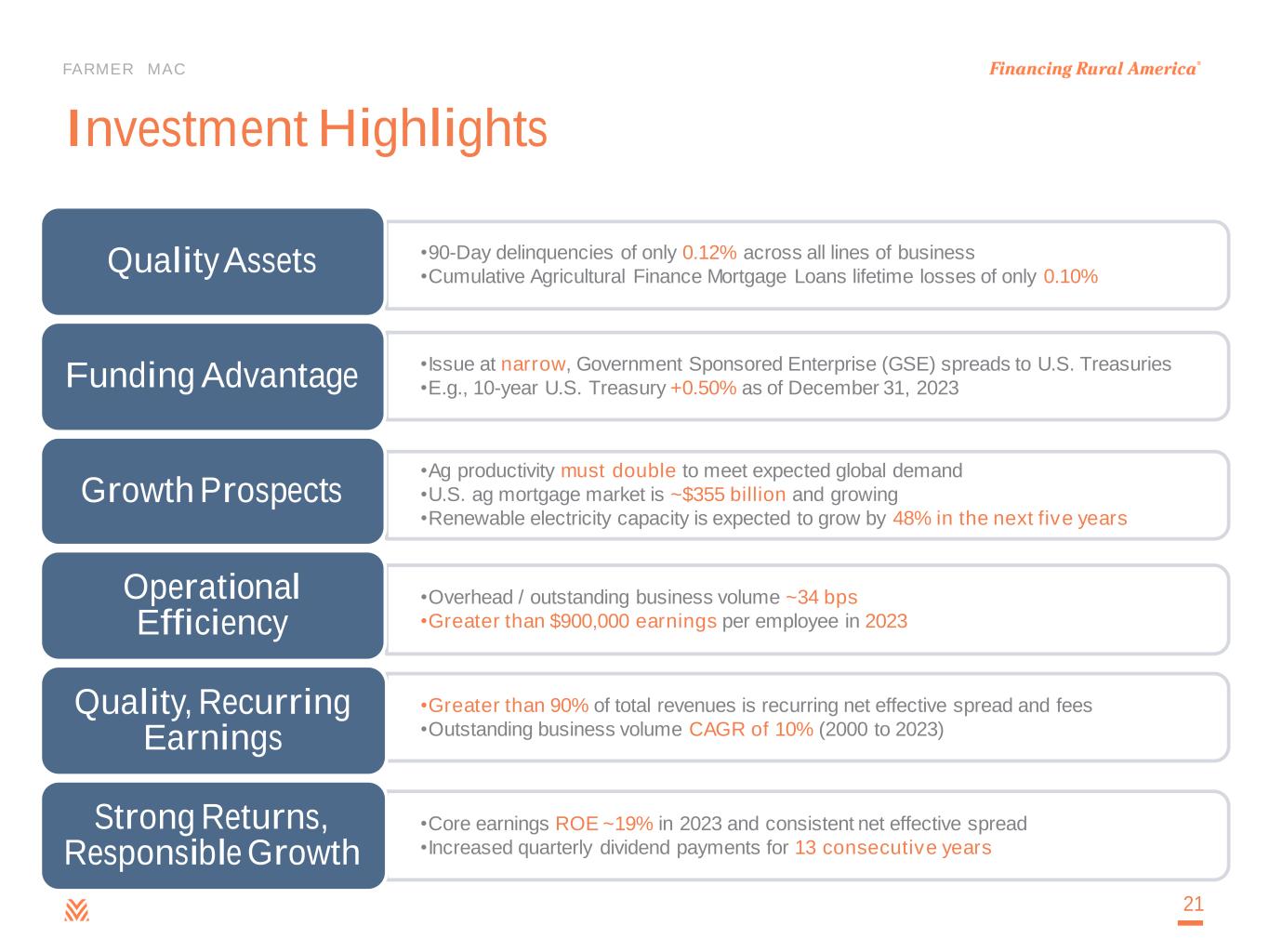 FARMER MAC $681 $713 $806 $863 $331 $497 $517 $589 $1,012 $1,210 $1,323 $1,452 14.2% 14.8% 14.9% 15.4% -2.0% 3.0% 8.0% 13.0% 18.0% 23.0% 28.0% 33.0% $0 $200 $400 $600 $800 $1,000 $1,200 $1,400 2020 2021 2022 2023 T IE R 1 C A P IT A L R A T IO ( % ) C O R E C A P IT A L $ IN M IL L IO N S Statutory Minimum Core Capital Core Capital Amount Above Statutory Minimum Capital Tier 1 Capital Ratio Strong and Growing Equity Capital Base 20Statutory Minimum Core Capital defined as total stockholders’ equity less accumulated other comprehensive income.
