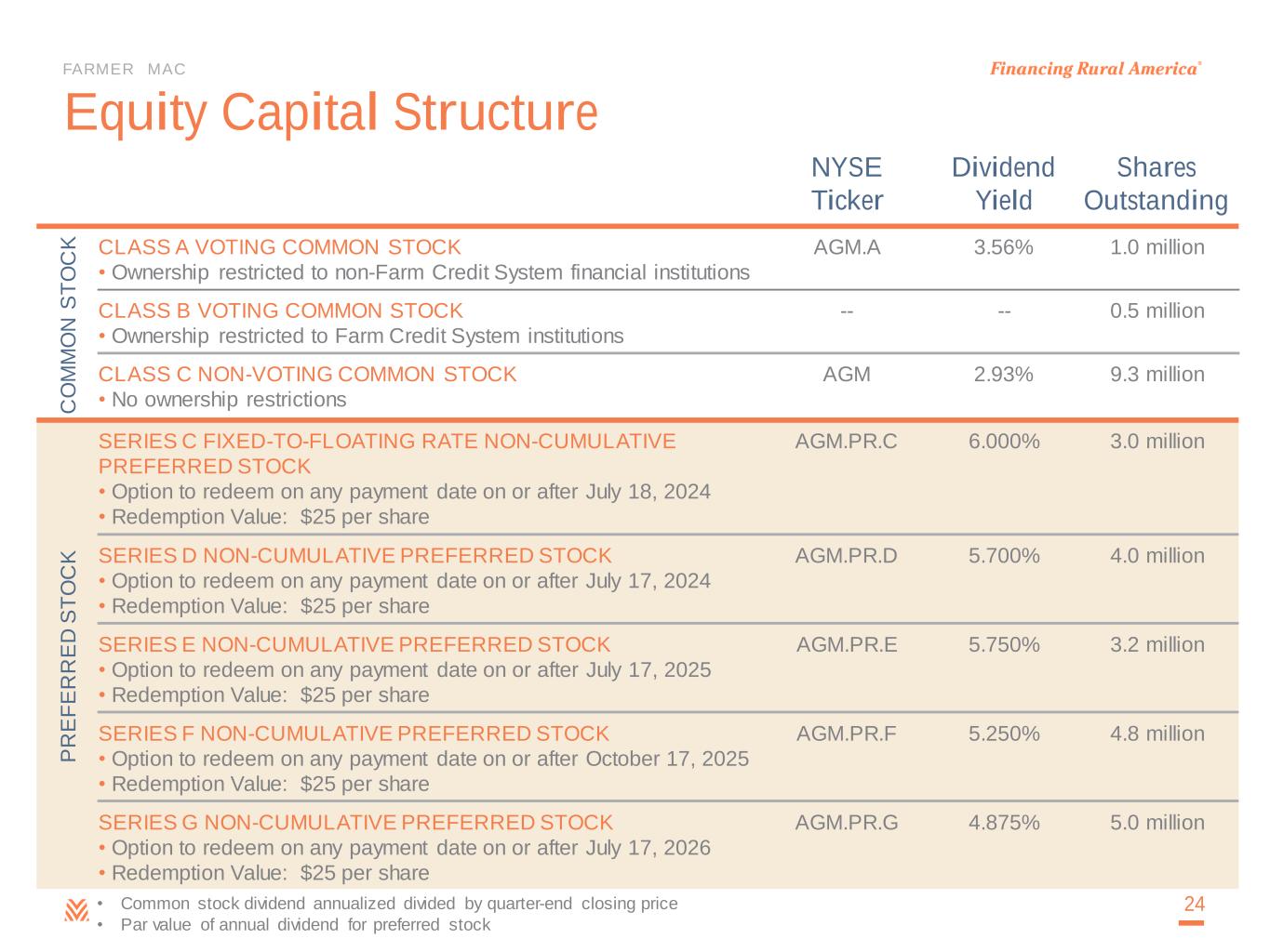 FARMER MAC • Core earnings, core earnings per share, and net effective spread are non-GAAP measures. For more information on the use of these non- GAAP measures, please see page 3. For a reconciliation of core earnings to GAAP net income attributable to common stockholders and core earnings per share to earnings per common share, and a reconciliation of net effective spread to GAAP net interest income, pl ease refer to pages 27-28 of the Appendix. • Book Value per Share excludes accumulated other comprehensive income. Key Company Metrics 23 ($ in thousands, except per share amounts) 2023 2022 2021 2020 2019 Core Earnings $171,156 $124,314 $113,570 $100,612 $93,742 Core Earnings per Diluted Share $15.65 $11.42 $10.47 $9.33 $8.70 Net Effective Spread ($) $326,980 $255,529 $220,668 $196,956 $168,608 Net Effective Spread (%) 1.18% 1.02% 0.98% 0.93% 0.91% Guarantee & Commitment Fees $18,928 $18,144 $17,533 $19,150 $21,335 Core Capital Above Statutory Minimum $589,400 $516,900 $496,800 $331,400 $196,700 Common Stock Dividends per Share $4.40 $3.80 $3.52 $3.20 $2.80 Outstanding Business Volume $28,471,024 $25,922,082 $23,614,463 $21,929,095 $21,117,942 90-Day Delinquencies 0.12% 0.17% 0.20% 0.21% 0.29% Recovery/(Credit Losses) $0 ($903) $1,054 ($5,759) ($67) Book Value per Share $89.24 $77.61 $67.37 $60.41 $54.80 Core Earnings Return on Equity 19% 16% 16% 16% 17%