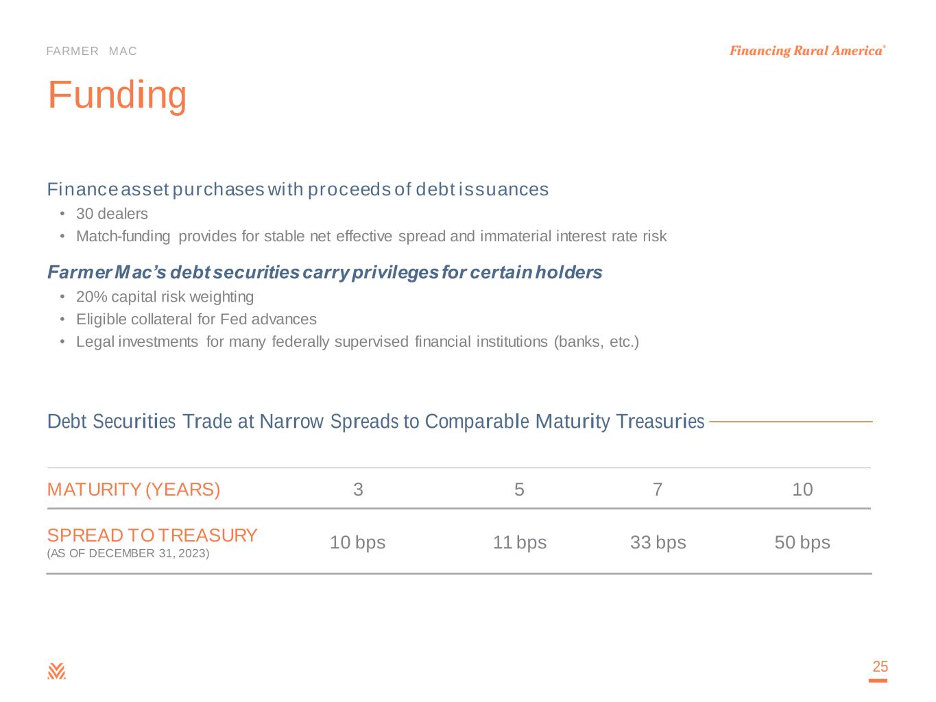 FARMER MAC Funding Finance asset purchases with proceeds of debt issuances • 30 dealers • Match-funding provides for stable net effective spread and immaterial interest rate risk Farmer Mac’s debt securities carry privileges for certain holders • 20% capital risk weighting • Eligible collateral for Fed advances • Legal investments for many federally supervised financial institutions (banks, etc.) 25 Debt Securities Trade at Narrow Spreads to Comparable Maturity Treasuries MATURITY (YEARS) 3 5 7 10 SPREAD TO TREASURY (AS OF DECEMBER 31, 2023) 10 bps 11 bps 33 bps 50 bps