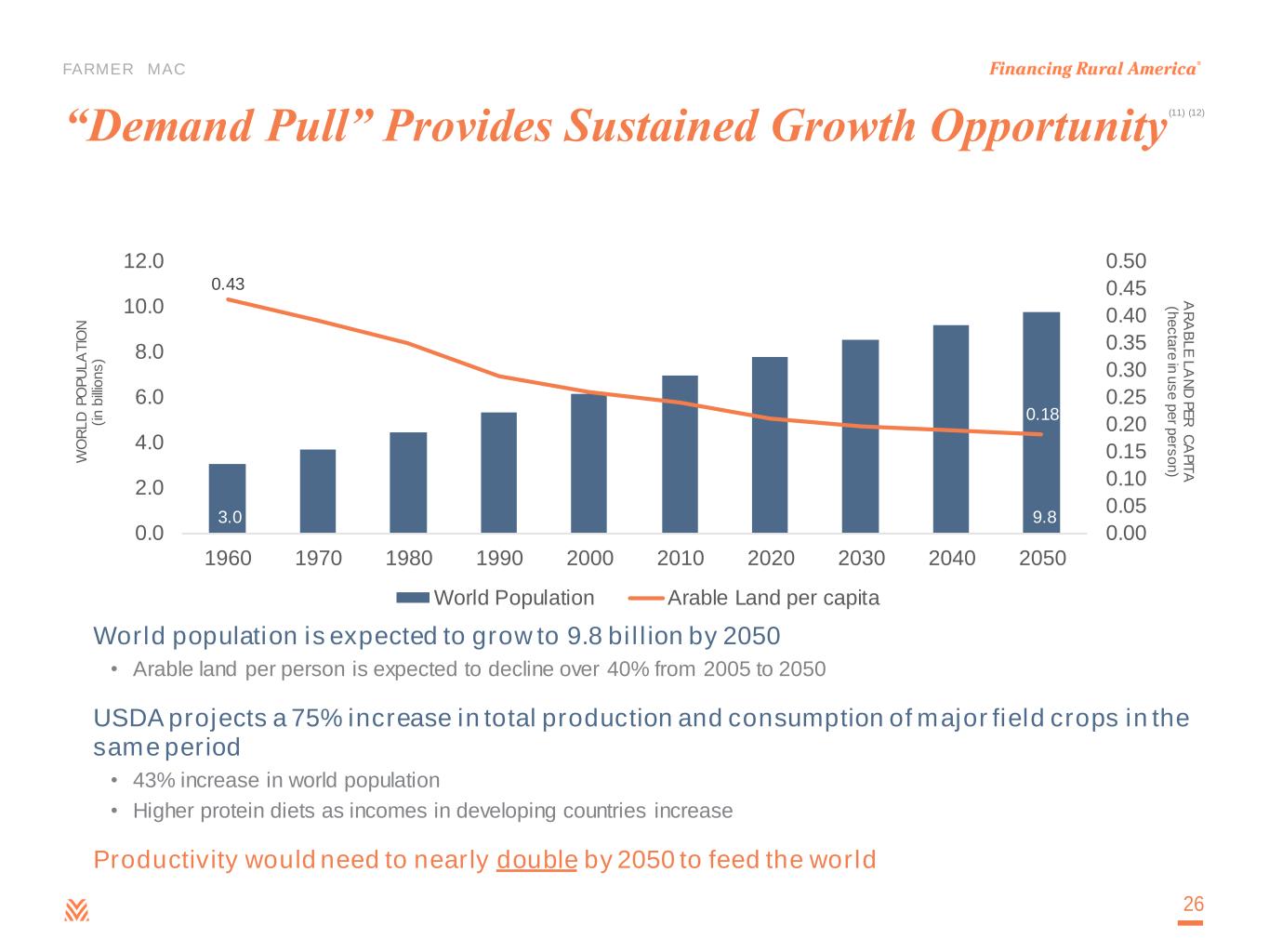 FARMER MAC World population is expected to grow to 9.8 billion by 2050 • Arable land per person is expected to decline over 40% from 2005 to 2050 USDA projects a 75% increase in total production and consumption of major field crops in the same period • 43% increase in world population • Higher protein diets as incomes in developing countries increase Productivity would need to nearly double by 2050 to feed the world “Demand Pull” Provides Sustained Growth Opportunity 3.0 9.8 0.43 0.18 0.00 0.05 0.10 0.15 0.20 0.25 0.30 0.35 0.40 0.45 0.50 0.0 2.0 4.0 6.0 8.0 10.0 12.0 1960 1970 1980 1990 2000 2010 2020 2030 2040 2050 A R A B L E L A N D P E R C A P IT A (h e c ta re in u s e p e r p e rs o n ) W O R L D P O P U L A T IO N (i n b ill io n s ) World Population Arable Land per capita 26 (11) (12)