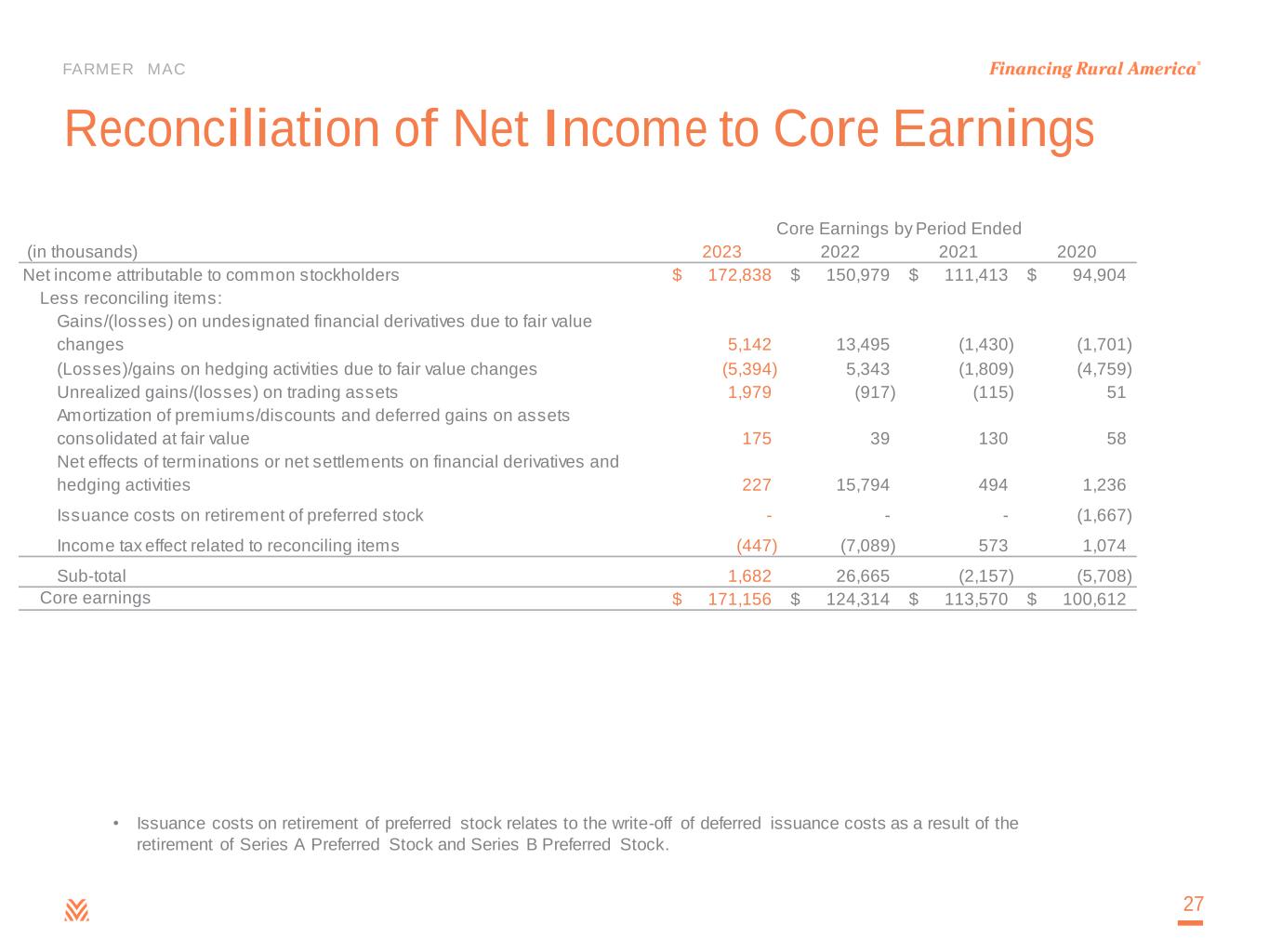 FARMER MAC Reconciliation of Net Income to Core Earnings 27 (in thousands) 2023 2022 2021 2020 Net income attributable to common stockholders 172,838$ 150,979$ 111,413$ 94,904$ Less reconciling items: Gains/(losses) on undesignated financial derivatives due to fair value changes 5,142 13,495 (1,430) (1,701) (Losses)/gains on hedging activities due to fair value changes (5,394) 5,343 (1,809) (4,759) Unrealized gains/(losses) on trading assets 1,979 (917) (115) 51 Amortization of premiums/discounts and deferred gains on assets consolidated at fair value 175 39 130 58 Net effects of terminations or net settlements on financial derivatives and hedging activities 227 15,794 494 1,236 Issuance costs on retirement of preferred stock - - - (1,667) Income tax effect related to reconciling items (447) (7,089) 573 1,074 Sub-total 1,682 26,665 (2,157) (5,708) Core earnings 171,156$ 124,314$ 113,570$ 100,612$ Core Earnings by Period Ended • Issuance costs on retirement of preferred stock relates to the write-off of deferred issuance costs as a result of the retirement of Series A Preferred Stock and Series B Preferred Stock.