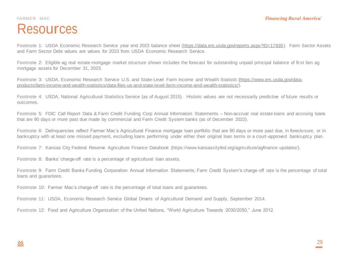 FARMER MAC Resources Footnote 1: USDA Economic Research Service year end 2023 balance sheet (https://data.ers.usda.gov/reports.aspx?ID=17835). Farm Sector Assets and Farm Sector Debt values are values for 2023 from USDA Economic Research Service. Footnote 2: Eligible ag real estate mortgage market structure shown includes the forecast for outstanding unpaid principal balance of first lien ag mortgage assets for December 31, 2023. Footnote 3: USDA, Economic Research Service U.S. and State-Level Farm Income and Wealth Statistic (https://www.ers.usda.gov/data- products/farm-income-and-wealth-statistics/data-files-us-and-state-level-farm-income-and-wealth-statistics/). Footnote 4: USDA, National Agricultural Statistics Service (as of August 2015). Historic values are not necessarily predictive of future results or outcomes. Footnote 5: FDIC Call Report Data & Farm Credit Funding Corp Annual Information Statements – Non-accrual real estate loans and accruing loans that are 90 days or more past due made by commercial and Farm Credit System banks (as of December 2022). Footnote 6: Delinquencies reflect Farmer Mac’s Agricultural Finance mortgage loan portfolio that are 90 days or more past due, in foreclosure, or in bankruptcy with at least one missed payment, excluding loans performing under either their original loan terms or a court -approved bankruptcy plan. Footnote 7: Kansas City Federal Reserve Agriculture Finance Databook (https://www.kansascityfed.org/agriculture/agfinance -updates/). Footnote 8: Banks’ charge-off rate is a percentage of agricultural loan assets. Footnote 9: Farm Credit Banks Funding Corporation Annual Information Statements; Farm Credit System’s charge-off rate is the percentage of total loans and guarantees. Footnote 10: Farmer Mac’s charge-off rate is the percentage of total loans and guarantees. Footnote 11: USDA, Economic Research Service Global Drivers of Agricultural Demand and Supply, September 2014. Footnote 12: Food and Agriculture Organization of the United Nations, “World Agriculture Towards 2030/2050,” June 2012. 29