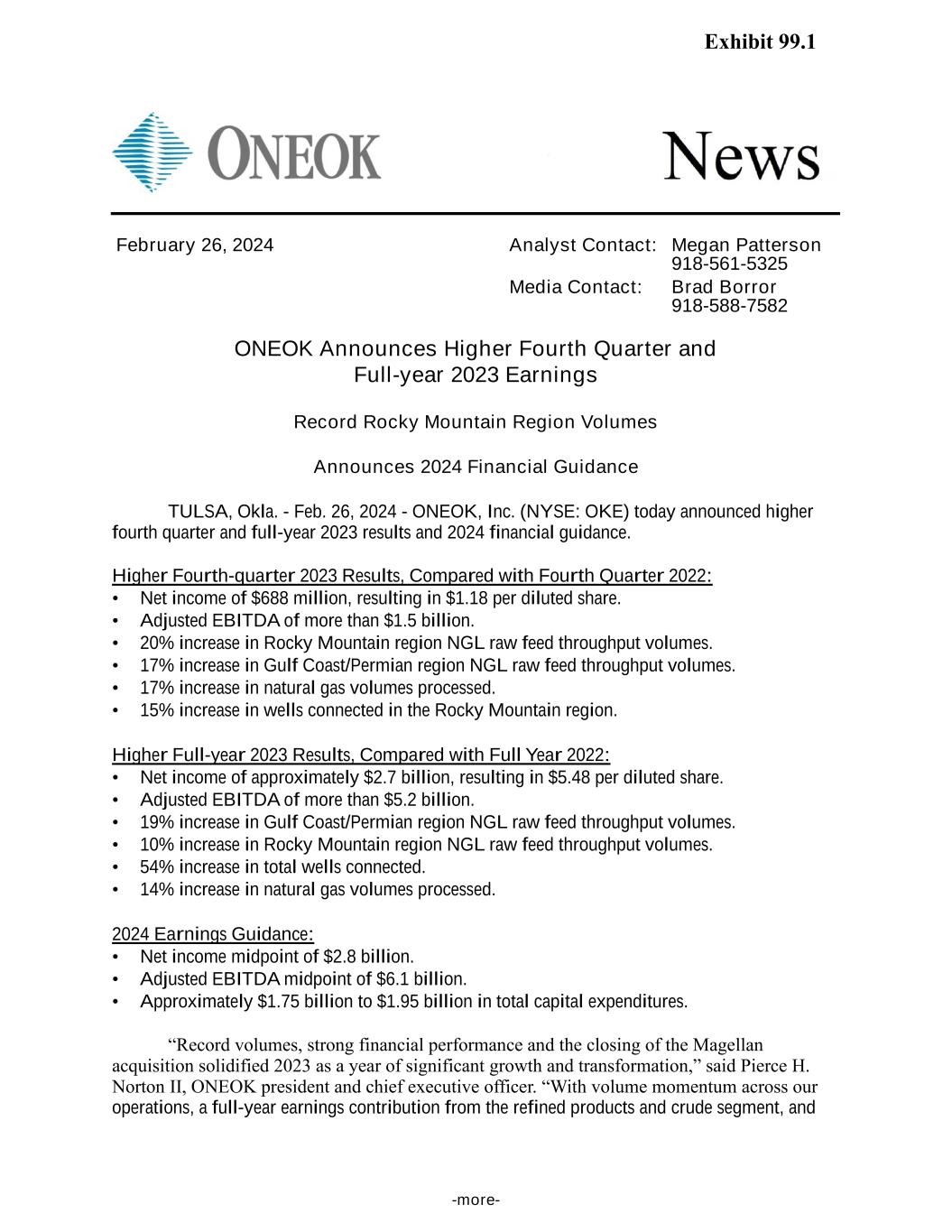 -more- February 26, 2024 Analyst Contact: Megan Patterson 918-561-5325 Media Contact: Brad Borror 918-588-7582 ONEOK Announces Higher Fourth Quarter and Full-year 2023 Earnings Record Rocky Mountain Region Volumes Announces 2024 Financial Guidance TULSA, Okla. - Feb. 26, 2024 - ONEOK, Inc. (NYSE: OKE) today announced higher fourth quarter and full-year 2023 results and 2024 financial guidance. Higher Fourth-quarter 2023 Results, Compared with Fourth Quarter 2022: • Net income of $688 million, resulting in $1.18 per diluted share. • Adjusted EBITDA of more than $1.5 billion. • 20% increase in Rocky Mountain region NGL raw feed throughput volumes. • 17% increase in Gulf Coast/Permian region NGL raw feed throughput volumes. • 17% increase in natural gas volumes processed. • 15% increase in wells connected in the Rocky Mountain region. Higher Full-year 2023 Results, Compared with Full Year 2022: • Net income of approximately $2.7 billion, resulting in $5.48 per diluted share. • Adjusted EBITDA of more than $5.2 billion. • 19% increase in Gulf Coast/Permian region NGL raw feed throughput volumes. • 10% increase in Rocky Mountain region NGL raw feed throughput volumes. • 54% increase in total wells connected. • 14% increase in natural gas volumes processed. 2024 Earnings Guidance: • Net income midpoint of $2.8 billion. • Adjusted EBITDA midpoint of $6.1 billion. • Approximately $1.75 billion to $1.95 billion in total capital expenditures. “Record volumes, strong financial performance and the closing of the Magellan acquisition solidified 2023 as a year of significant growth and transformation,” said Pierce H. Norton II, ONEOK president and chief executive officer. “With volume momentum across our operations, a full-year earnings contribution from the refined products and crude segment, and Exhibit 99.1